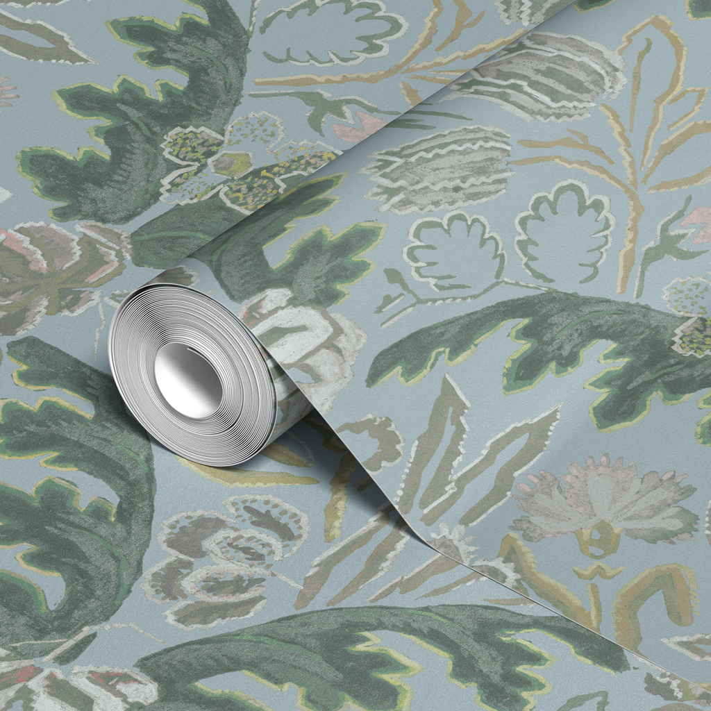 Elegant floral damask pattern with tulips and leaves in a sophisticated palette of sage, forest green, and soft blue tones. Traditional heritage design with flowing organic forms.