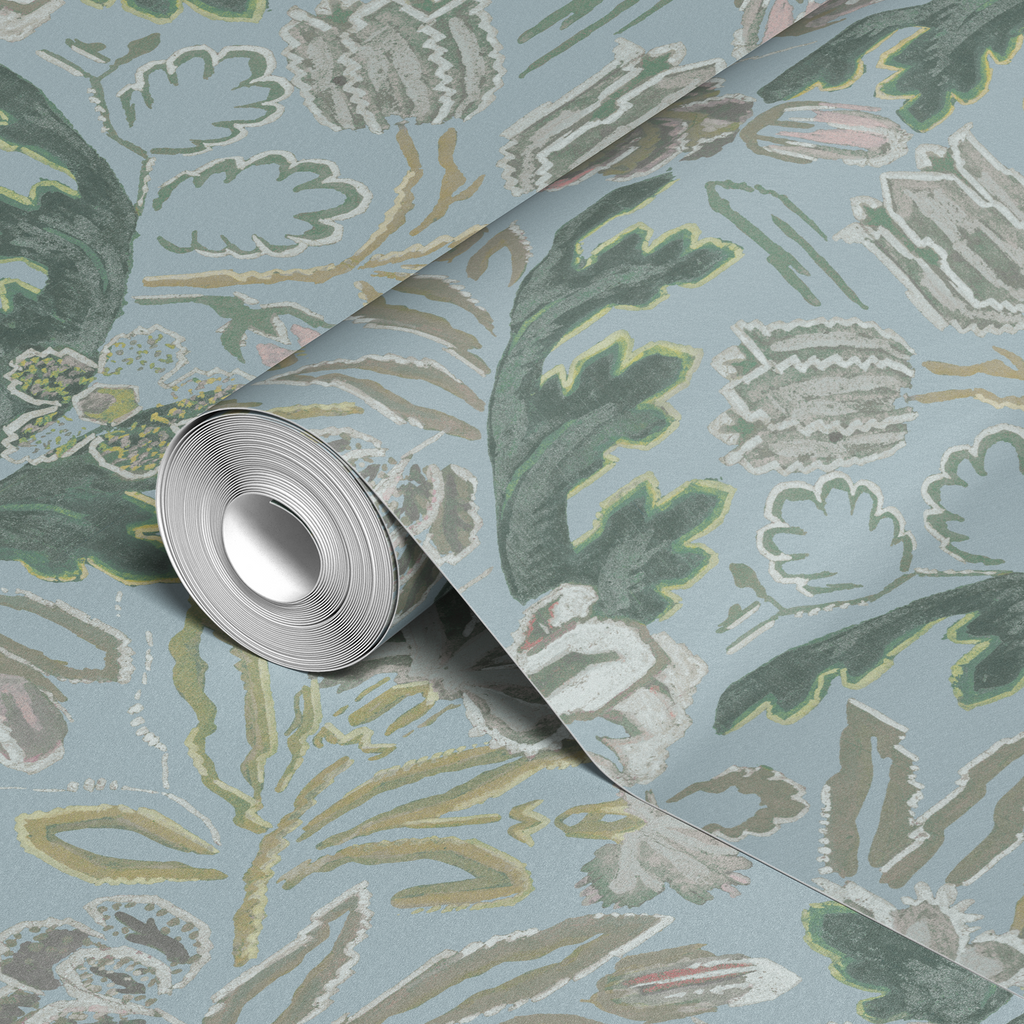 Elegant botanical damask pattern featuring stylized tulips and foliage in soft blue-green tones, perfect for traditional home decor projects.