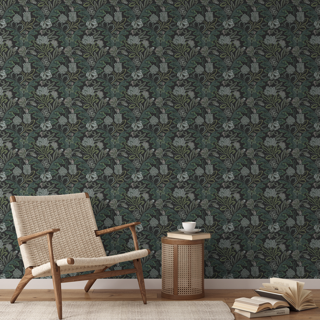 Elegant traditional floral damask with stylized tulips and foliage in deep emerald, sage, and silvery tones on a dark background - perfect for heritage-inspired home decor.