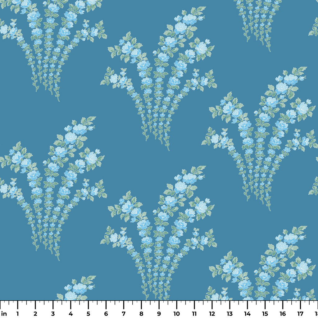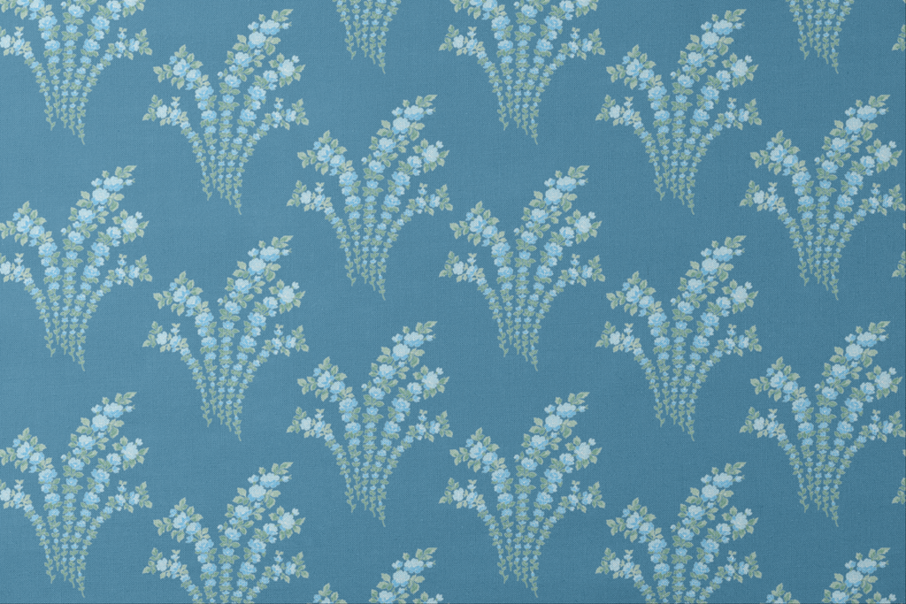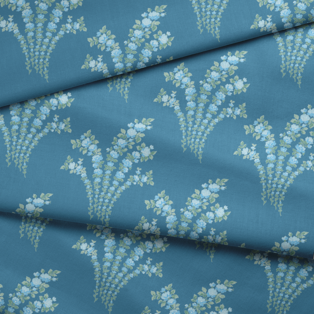 Cascading pale blue blossoms with soft blue-green foliage form an enchanting vintage floral design. This pattern captures a sense of timeless elegance and natural beauty, rooted in a romantic, heritage-inspired style.