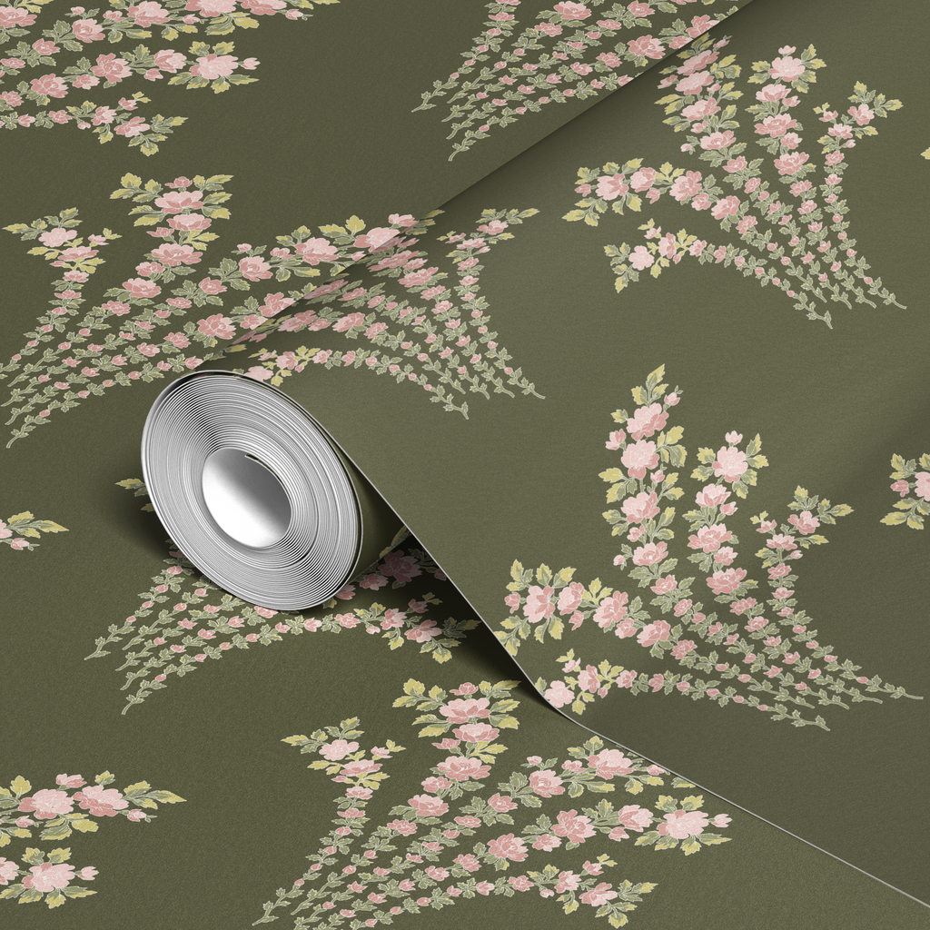 Elegant vintage floral pattern with cascading pink roses and delicate vine elements on a rich olive green background, perfect for heritage-inspired home decor.