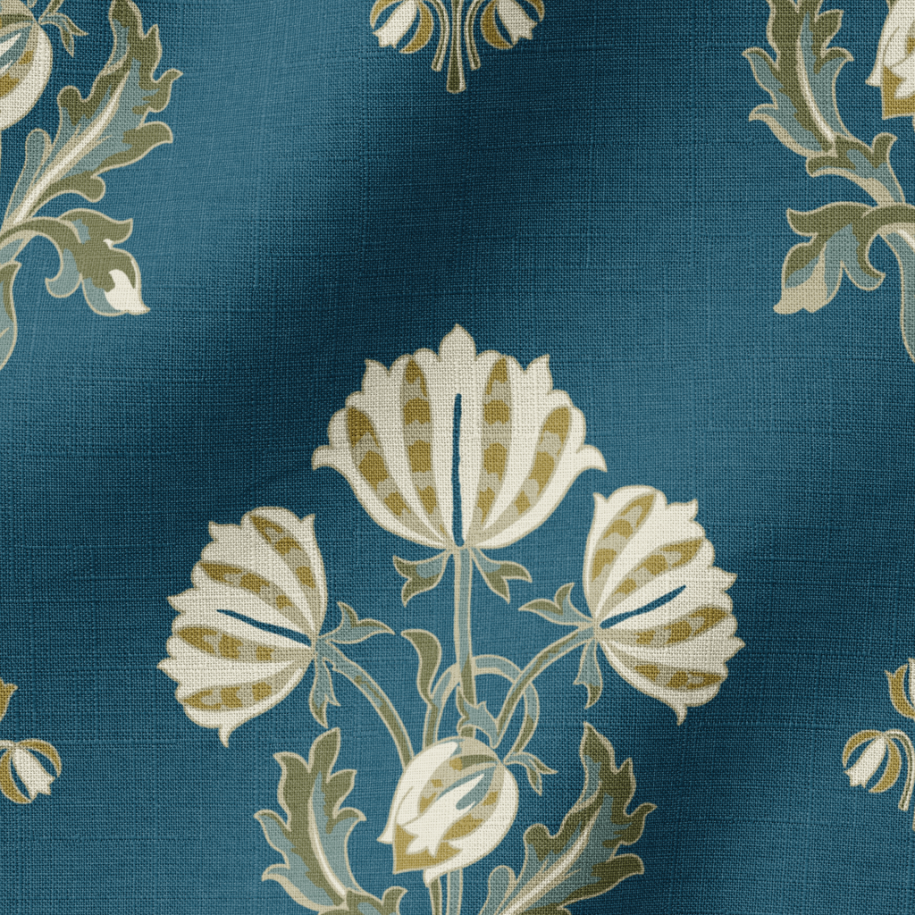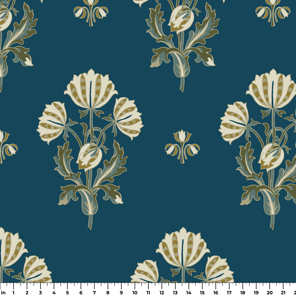 Elegant traditional floral motif on deep blue background. This heritage-inspired botanical pattern features stylized blooms with curved stems in a timeless repeating layout, adding a beautiful touch to any space.