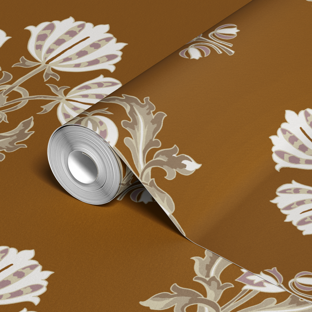 Elegant traditional floral motif on rich brown background. This heritage-inspired botanical pattern features stylized blooms with curved stems in a timeless repeating layout, adding a beautiful touch to any space.