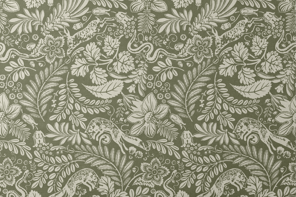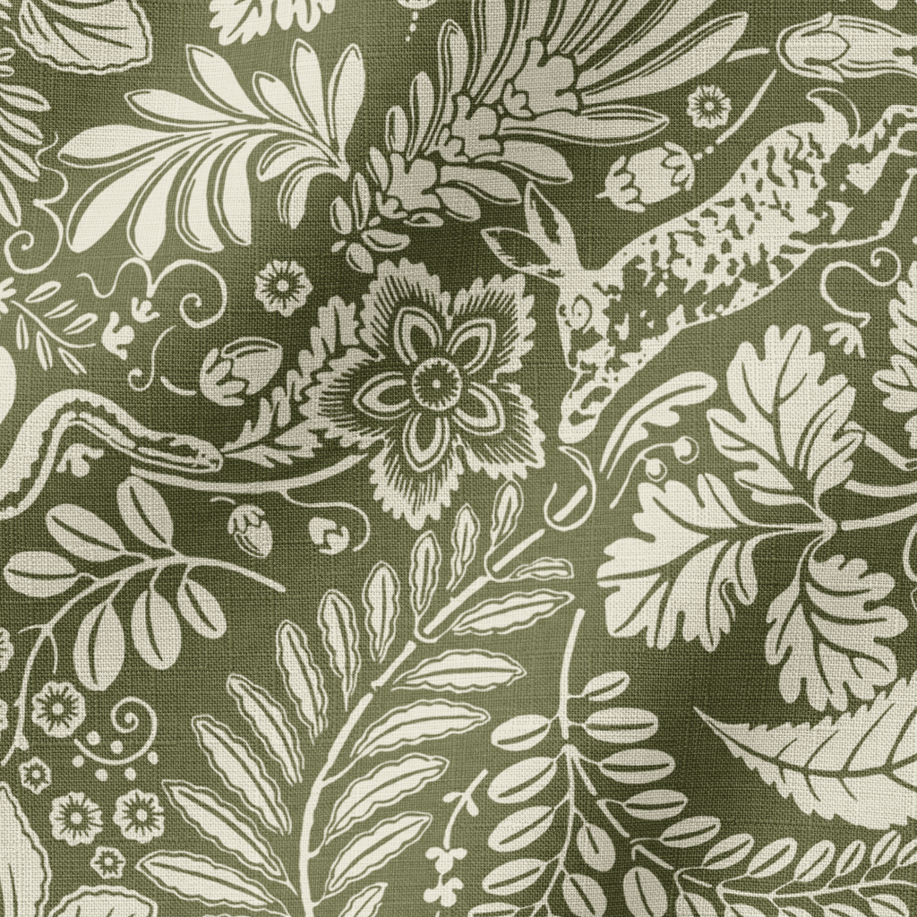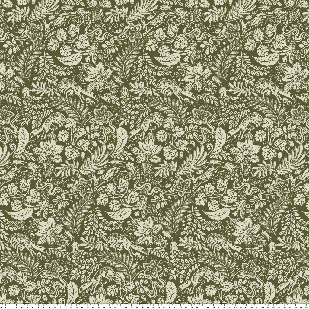 Vintage woodland botanical wallpaper in olive green featuring delicate floral patterns and organic fern motifs with a traditional heritage feel designed for any room.