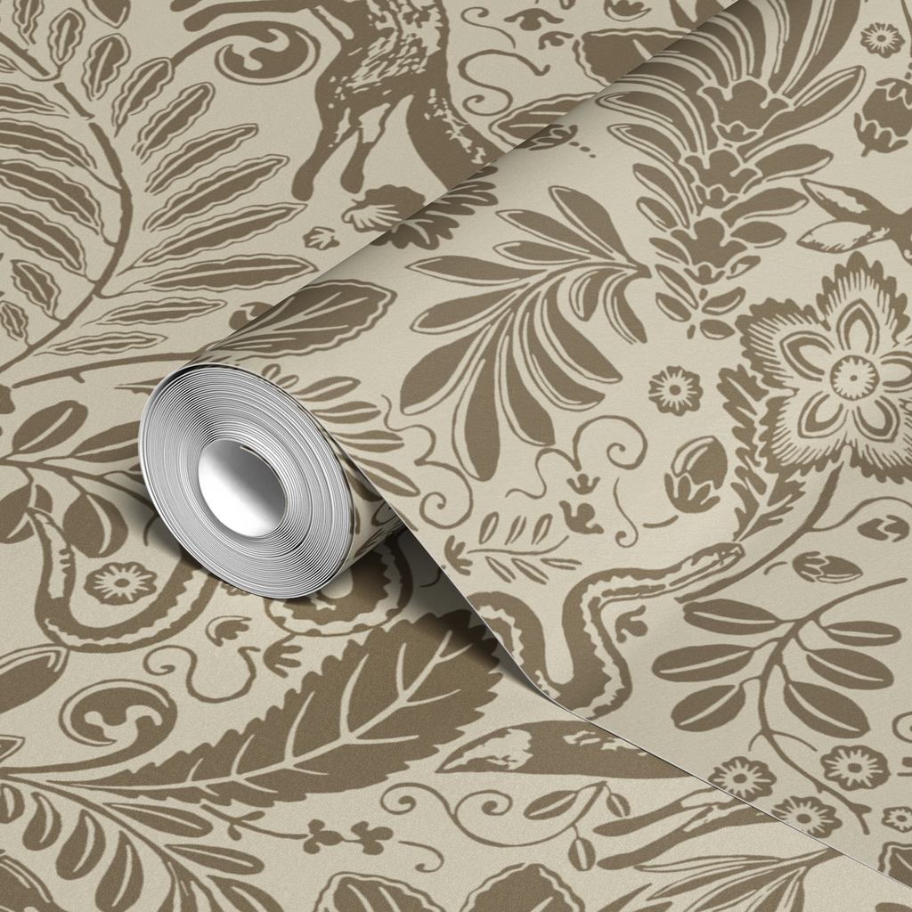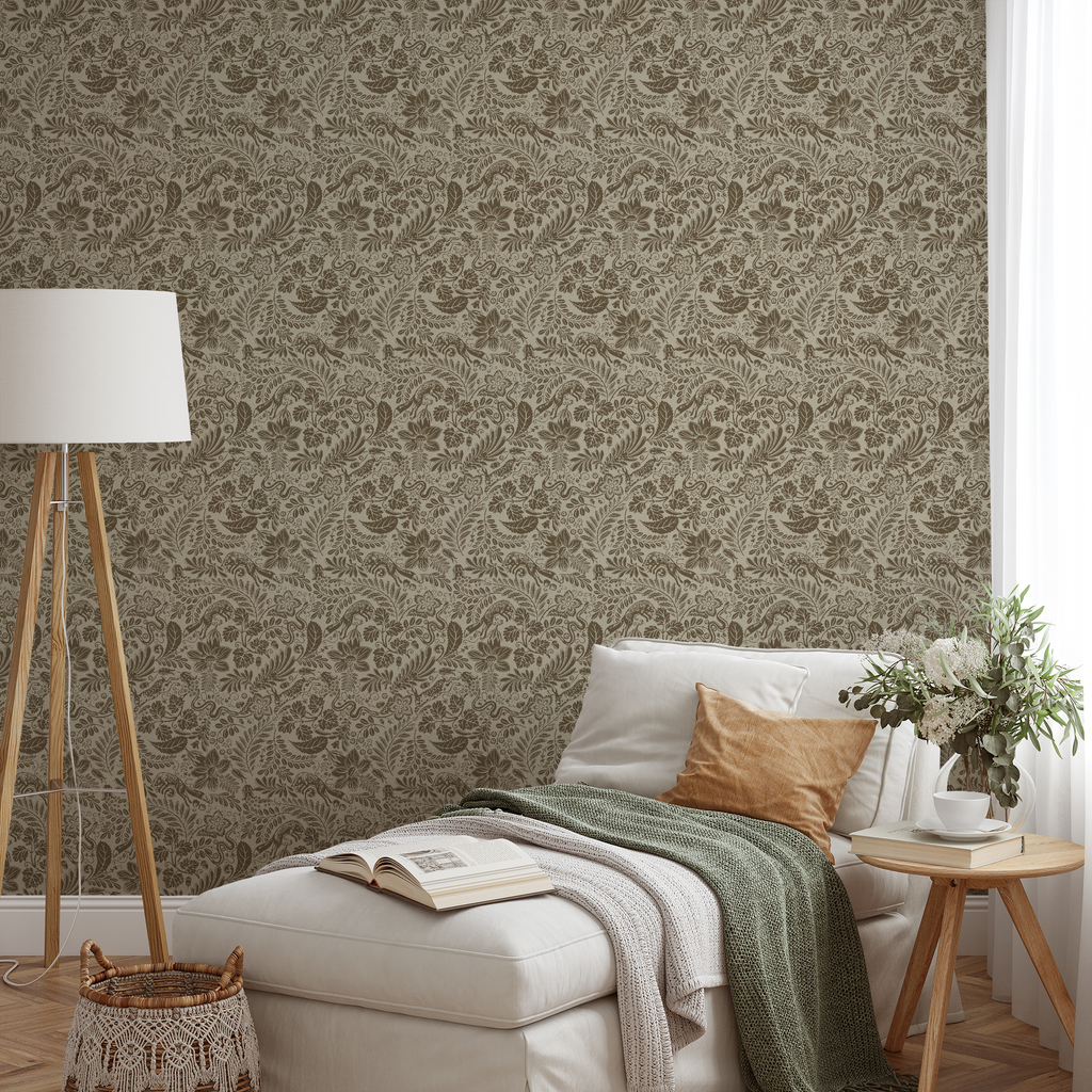 Vintage woodland botanical wallpaper in light brown featuring delicate floral patterns and organic fern motifs with a traditional heritage feel designed for any room.