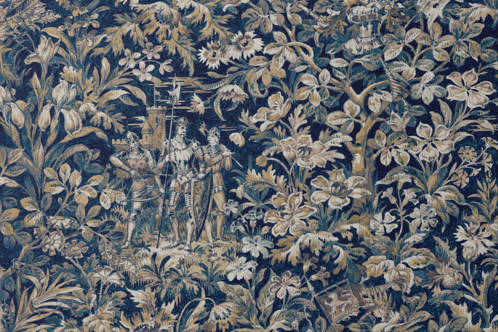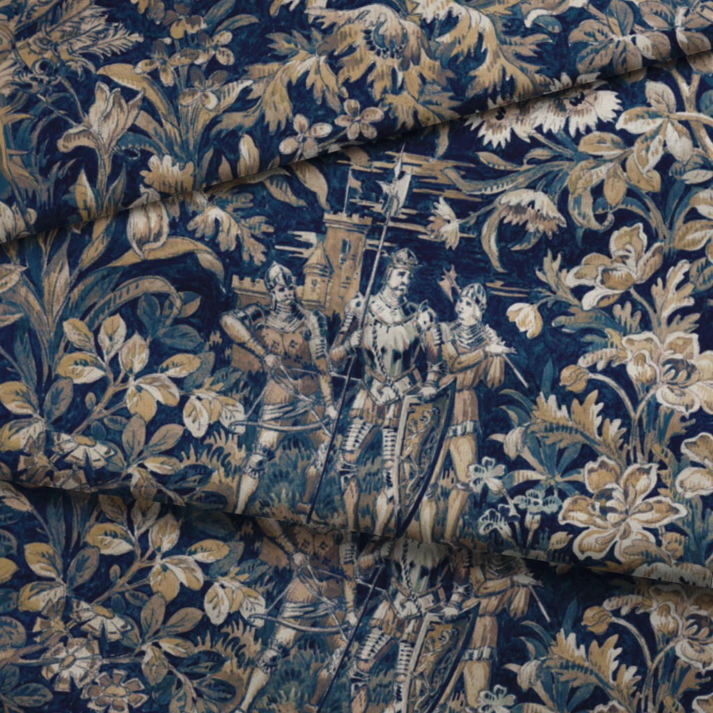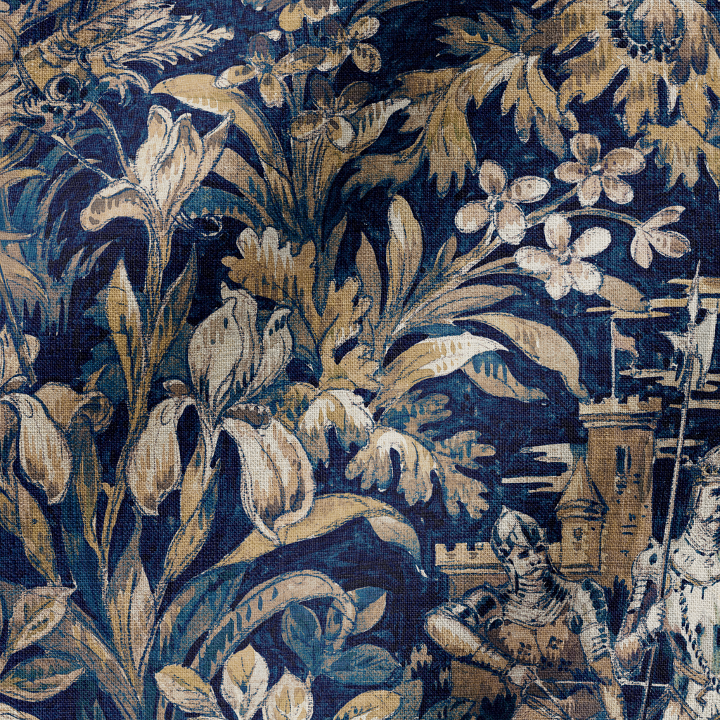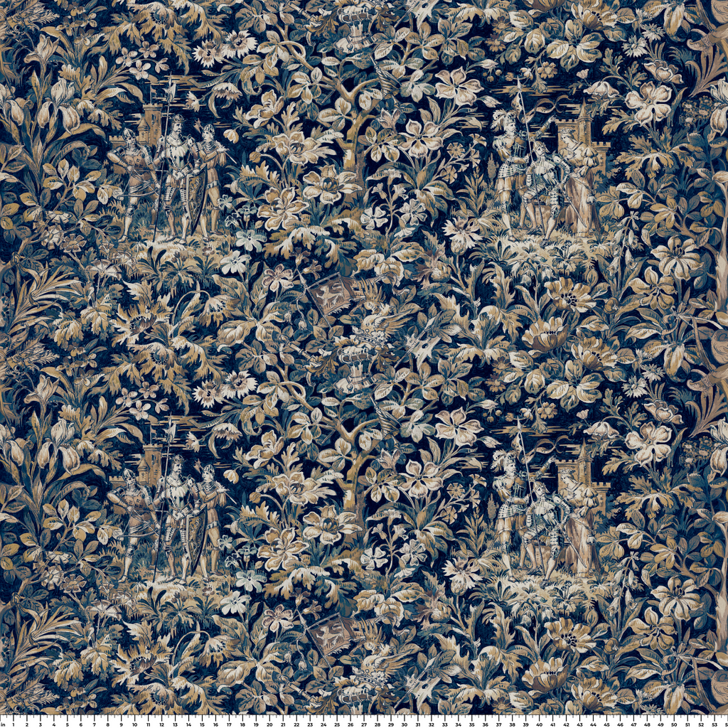 This intricate design features a rich navy blue background with elaborate floral and foliage patterns in beige tones, creating an elegant verdant garden scene reminiscent of medieval European art.