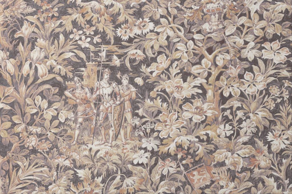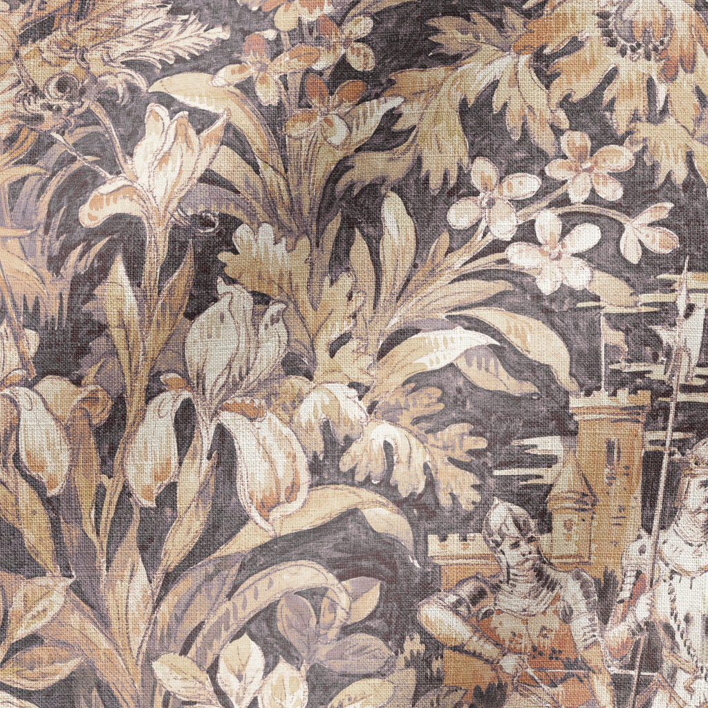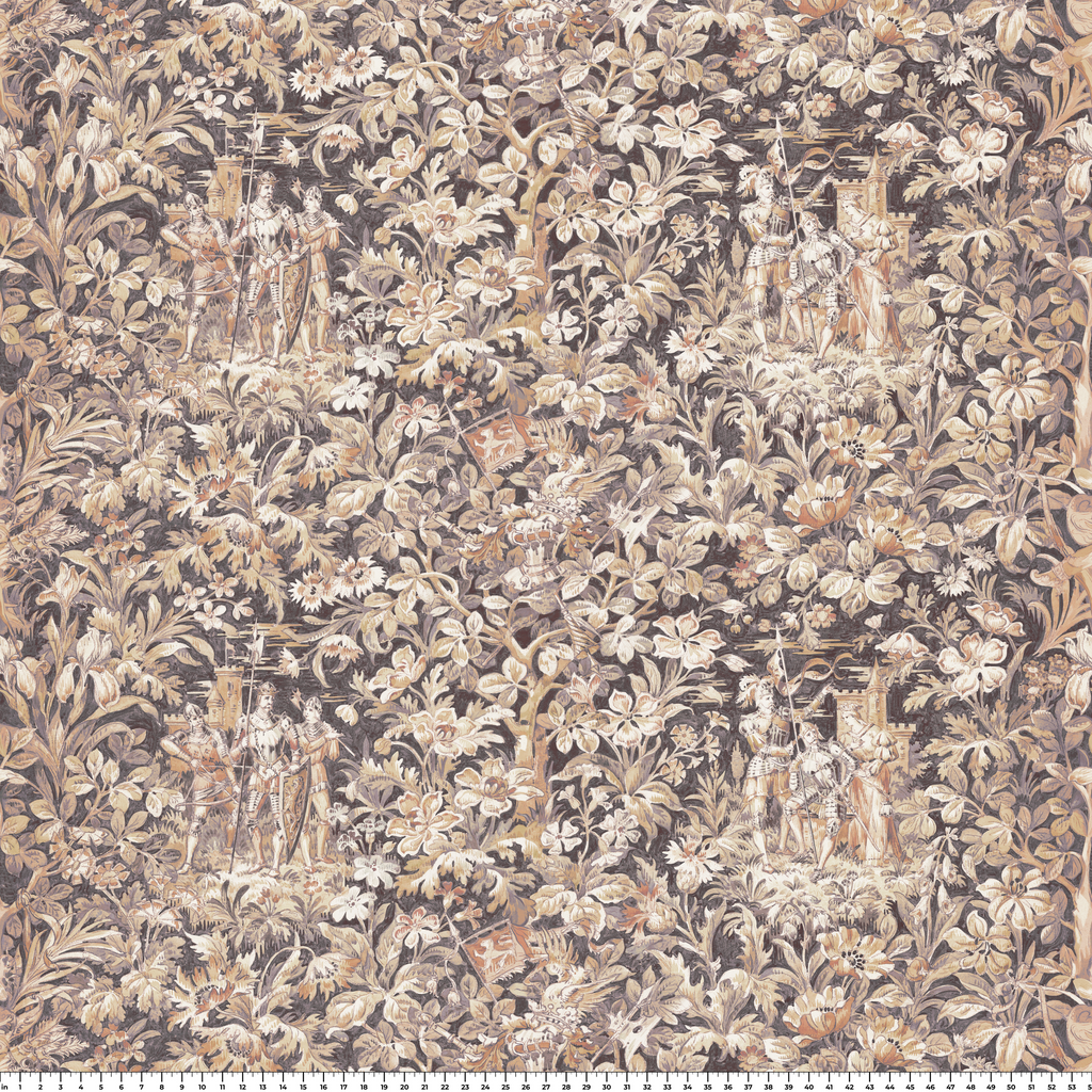 This intricate design features a rich brown background with elaborate floral and foliage patterns in cream tones, creating an elegant verdant garden scene reminiscent of medieval European art.