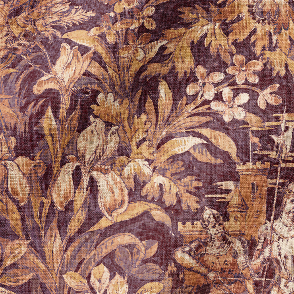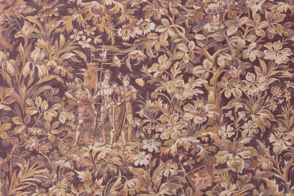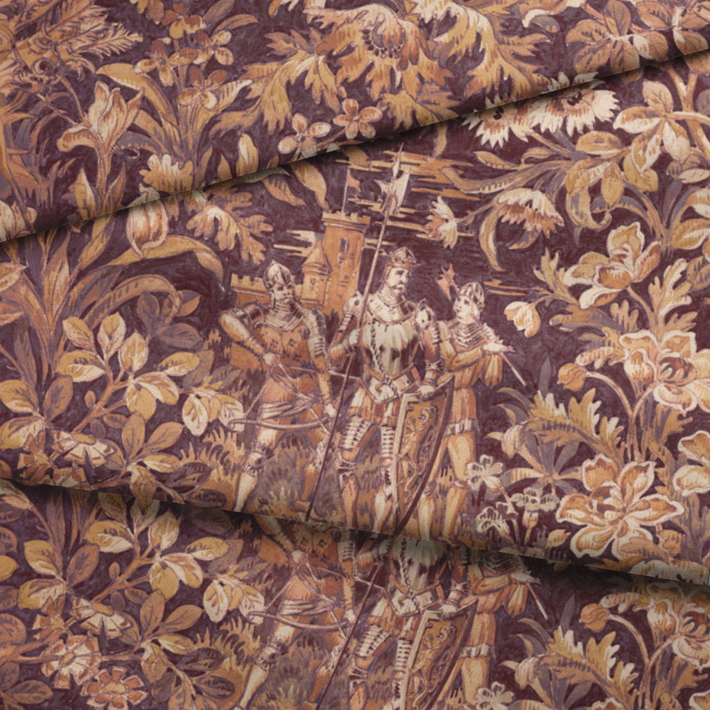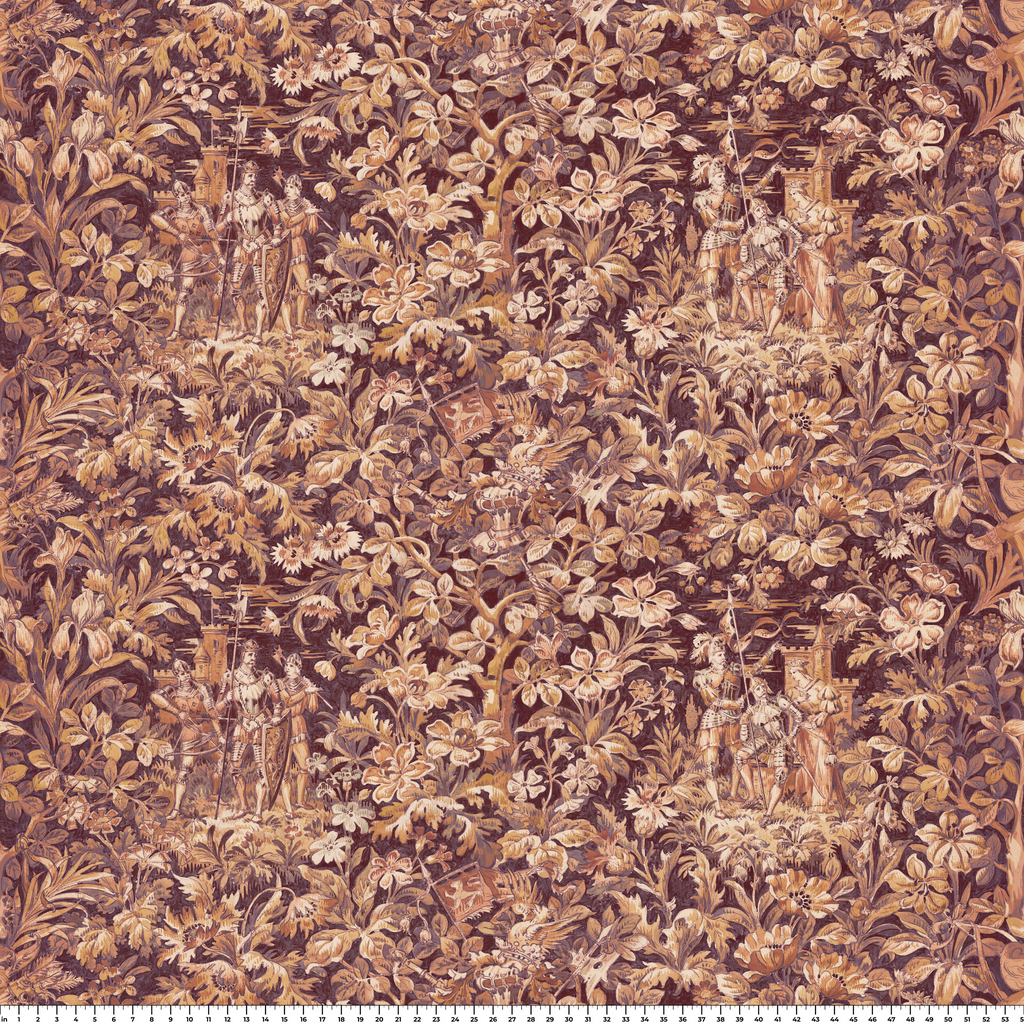 This intricate design features a rich red background with elaborate floral and foliage patterns in cream tones, creating an elegant verdant garden scene reminiscent of medieval European art.