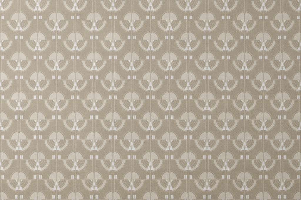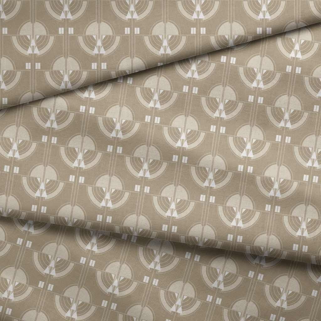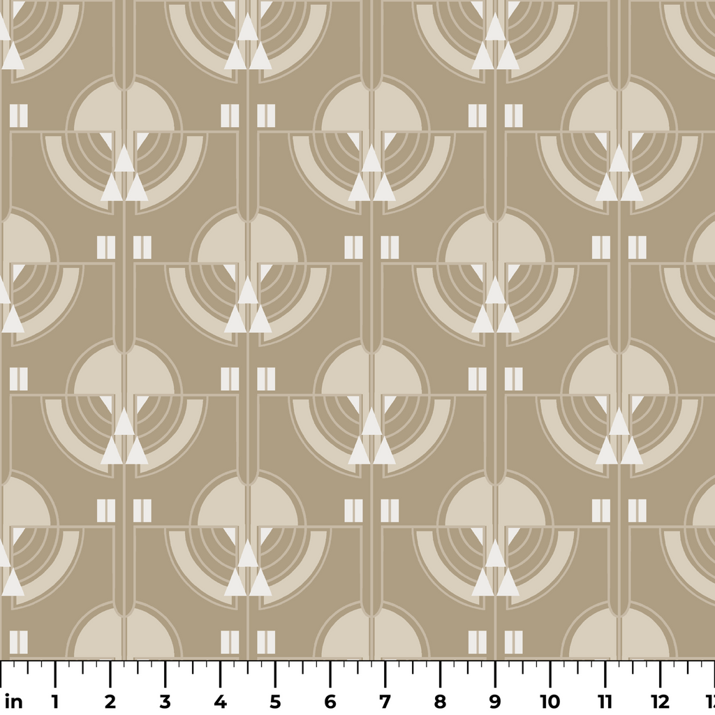 This elegant Art Deco wallpaper features geometric semicircles and triangles in light brown and cream, creating a sophisticated mid-century modern pattern perfect for contemporary interior design.