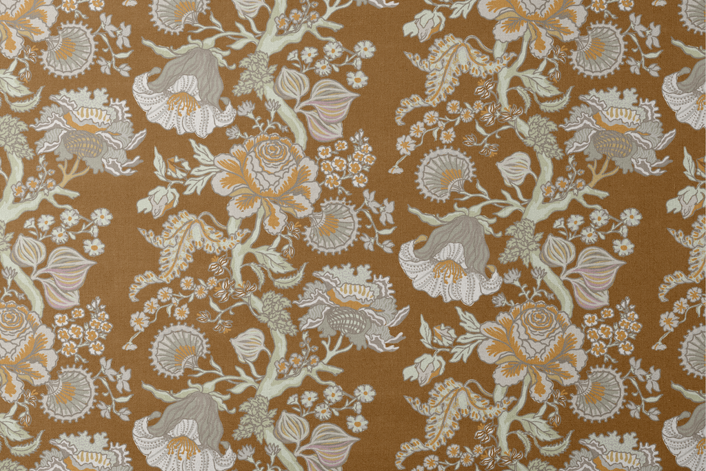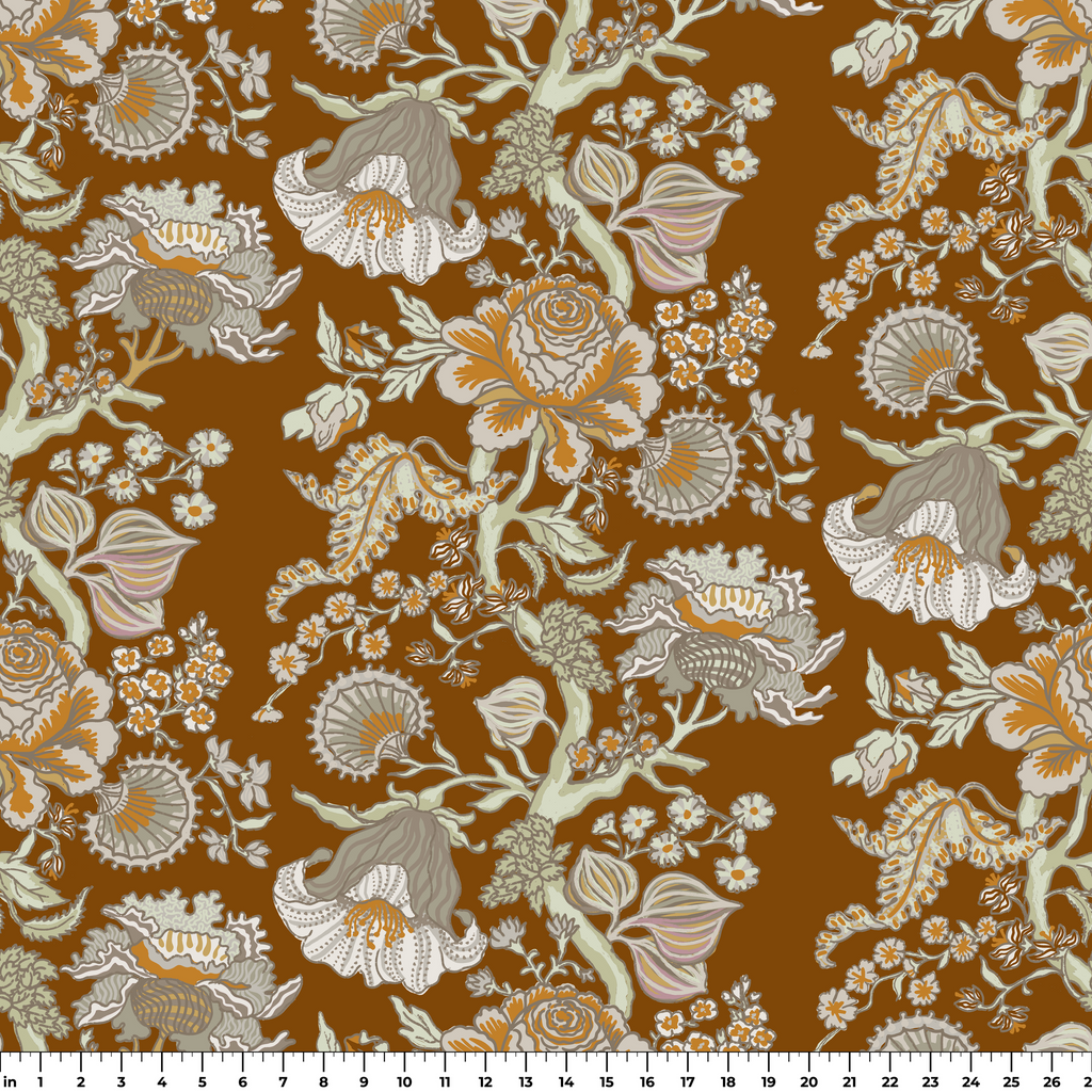 Luxurious floral pattern featuring detailed botanical illustrations in cream and pale blue on a rich brown background. Perfect for an elegant space with its vintage, heritage appeal.