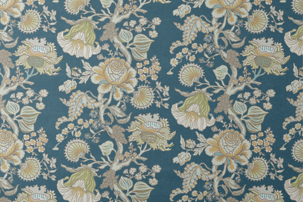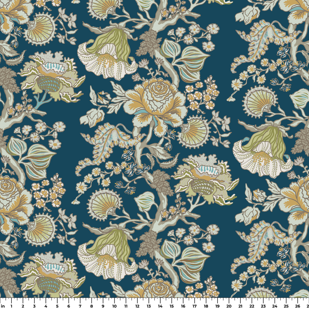 Luxurious floral pattern featuring detailed botanical illustrations in green and beige on a blue background. Perfect for an elegant space with its vintage, heritage appeal.