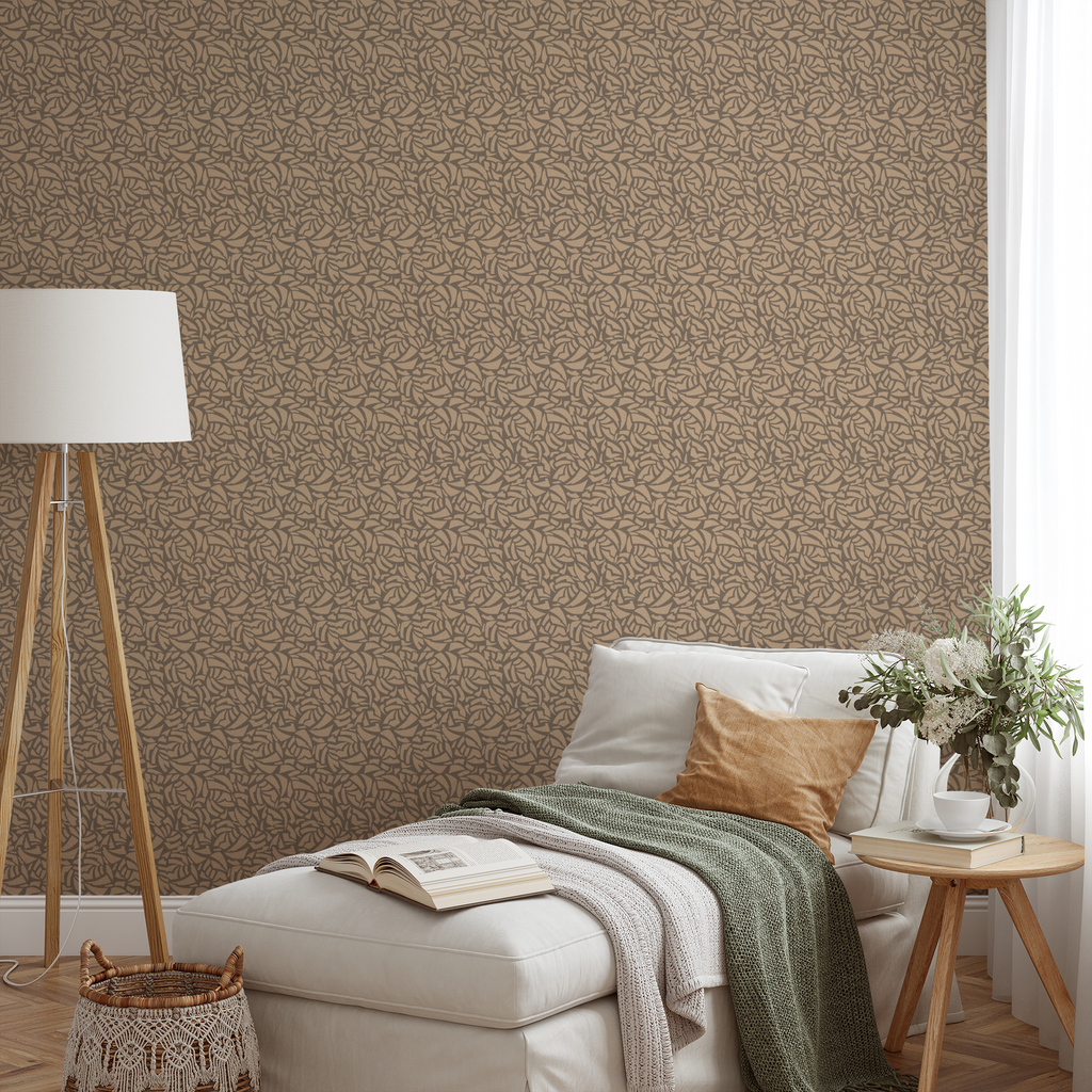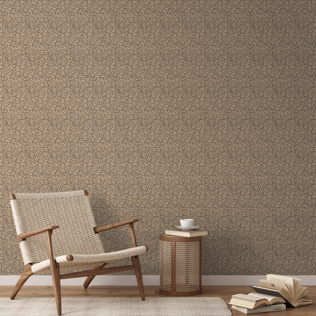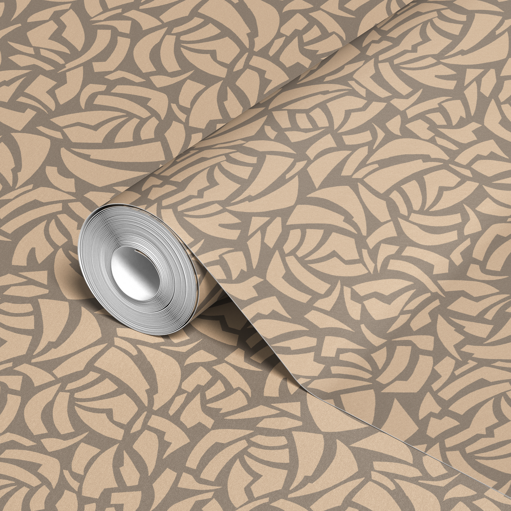 Abstract organic shapes create a sophisticated pattern in neutral beige and taupe tones, perfect for contemporary home decor or upholstery with a minimalist aesthetic.