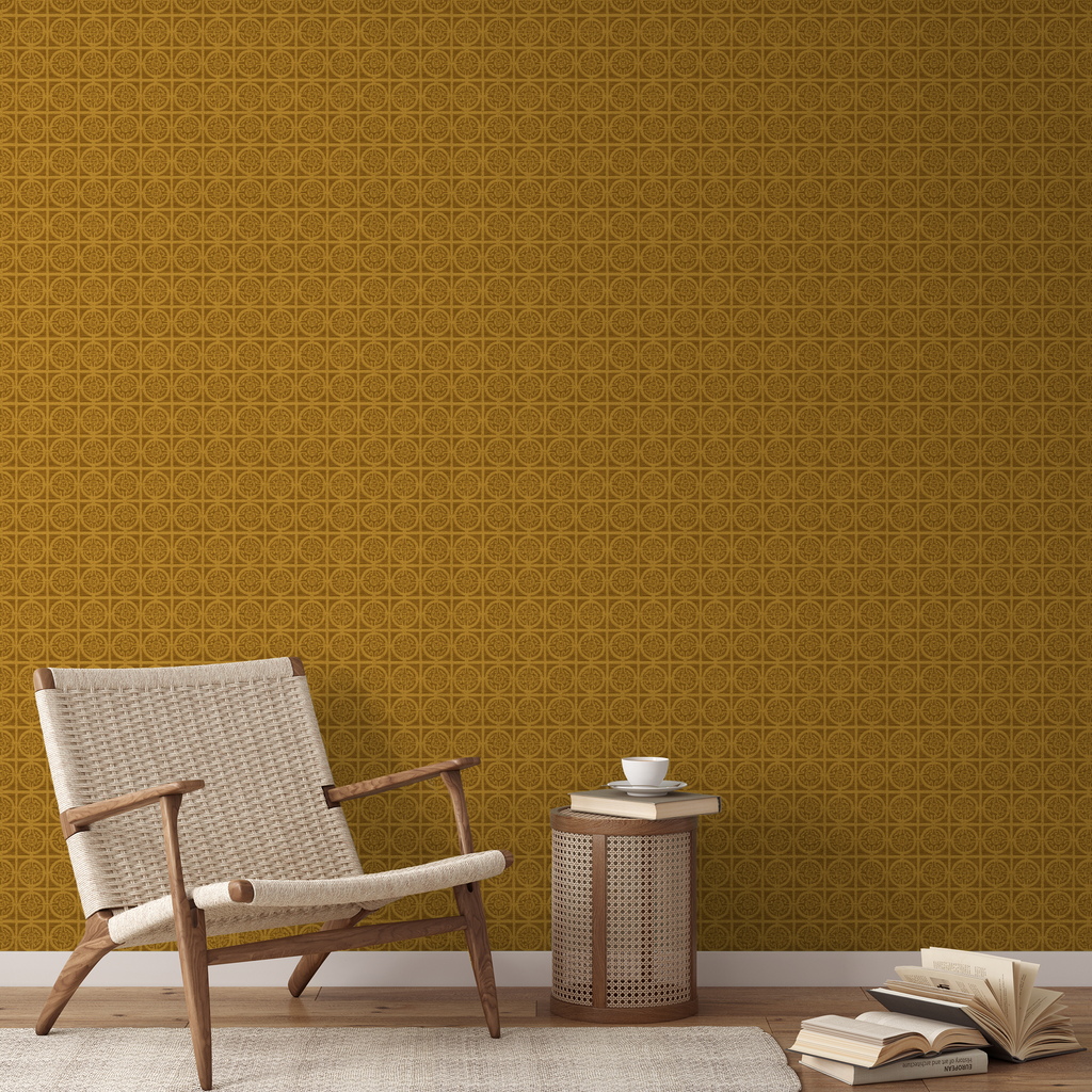 Elegant geometric damask pattern in rich golden hues with traditional medallion motifs, perfect for heritage-inspired home decor.