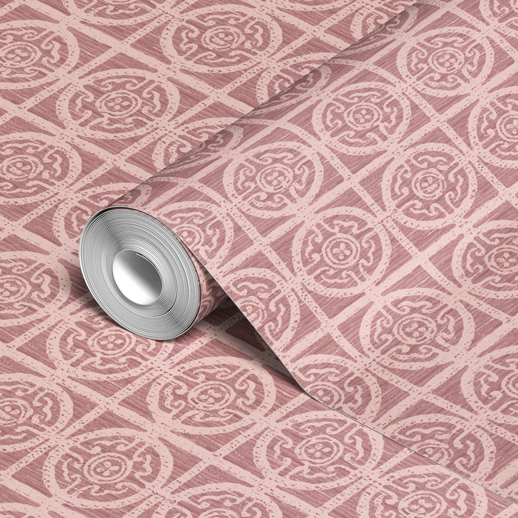 Elegant geometric medallion pattern in dusty rose and cream tones creates a traditional damask-inspired design with graceful curves and intricate detailing.