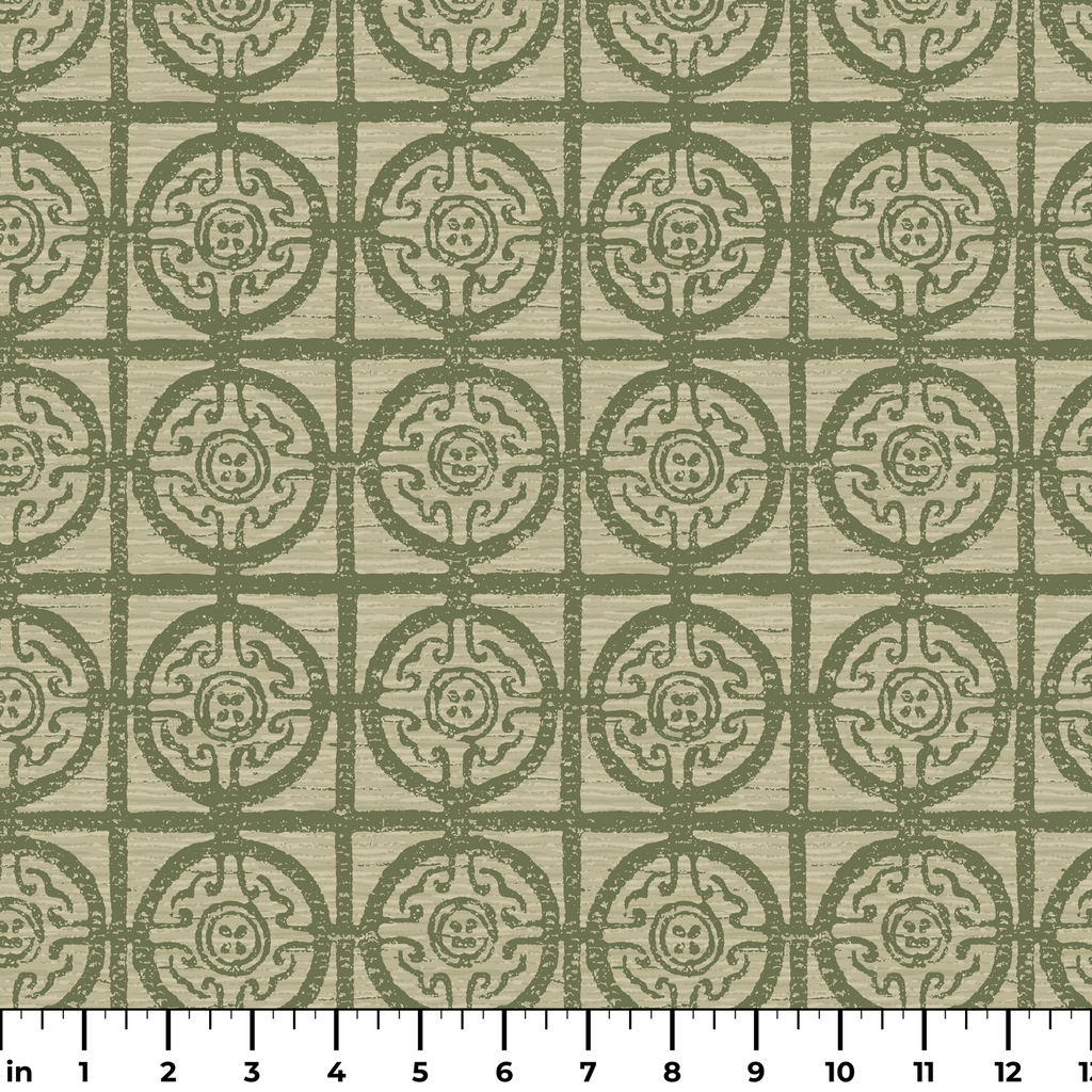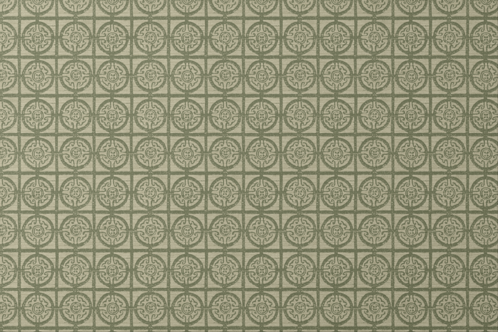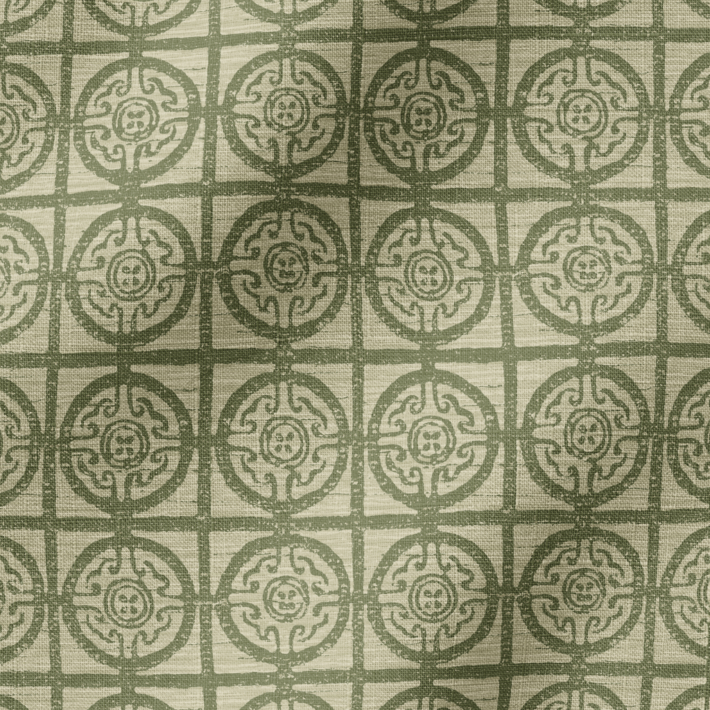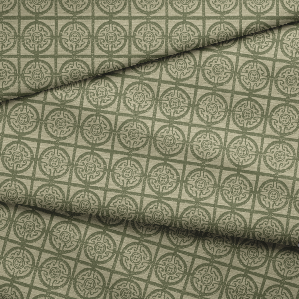 Elegant geometric medallion pattern in sage green combines traditional motifs with a contemporary twist, perfect for sophisticated home decor with a heritage-inspired aesthetic.