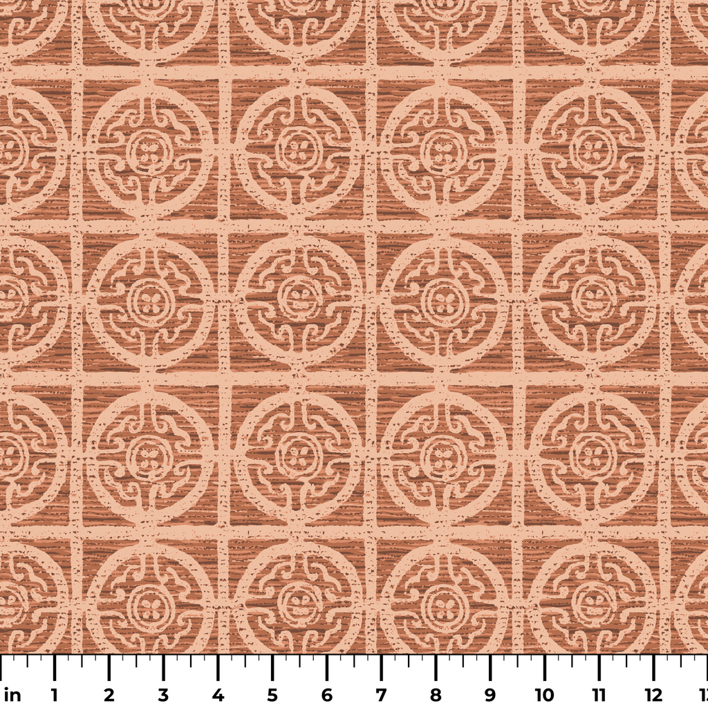 Elegant terracotta geometric pattern featuring traditional medallions and Celtic-inspired motifs in a seamless layout, perfect for heritage-inspired home decor or upholstery projects.