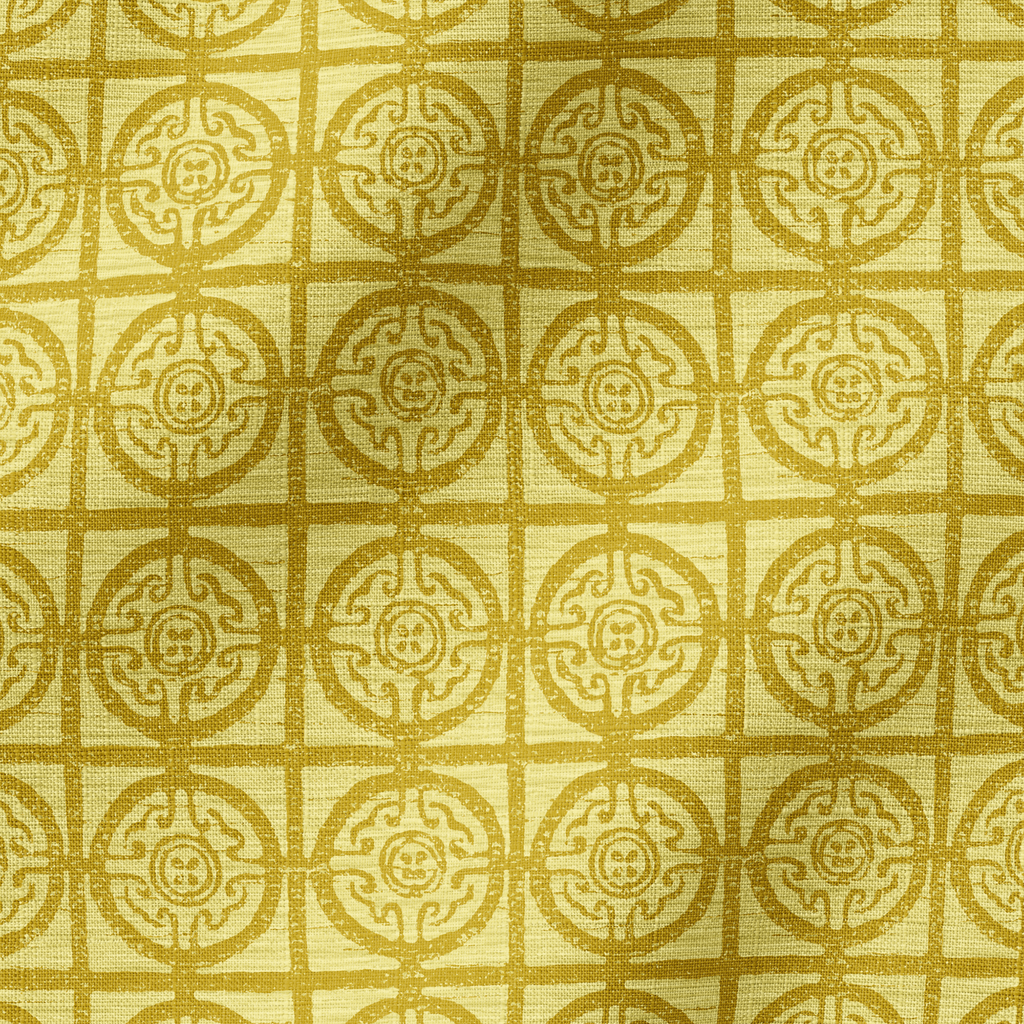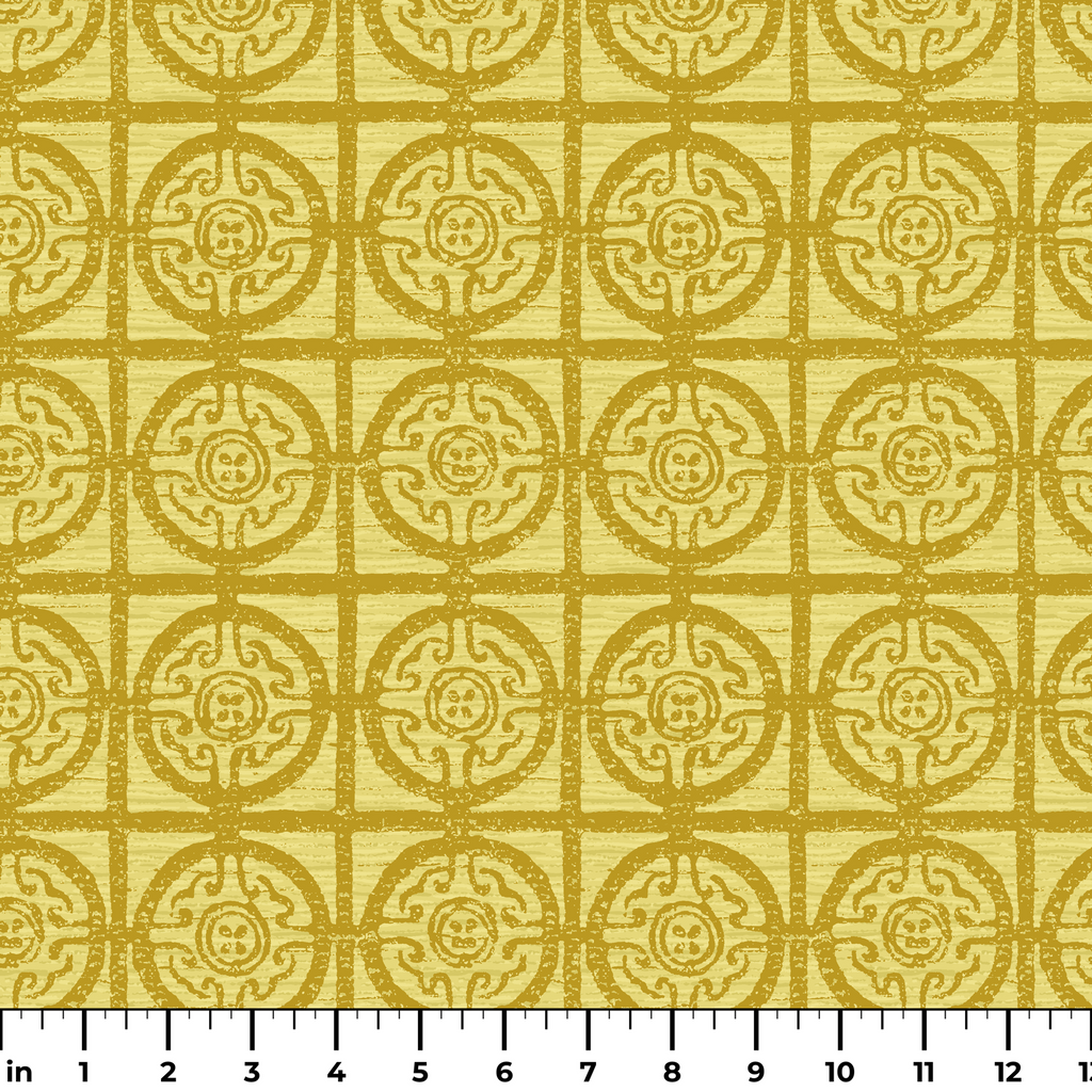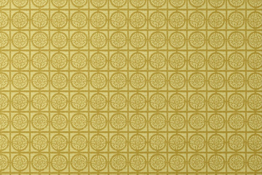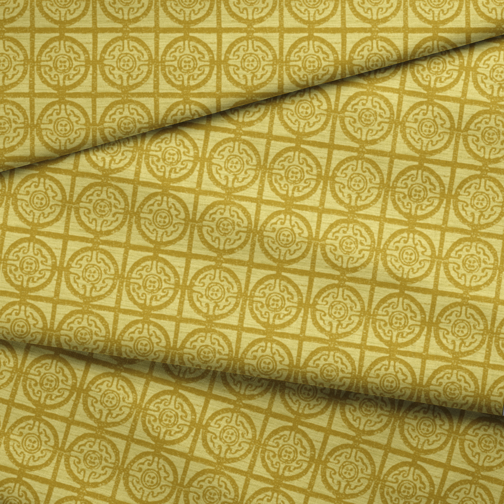 Elegant gold geometric damask pattern with traditional circular motifs and intricate scrollwork on a light backdrop, perfect for heritage-inspired home decor.