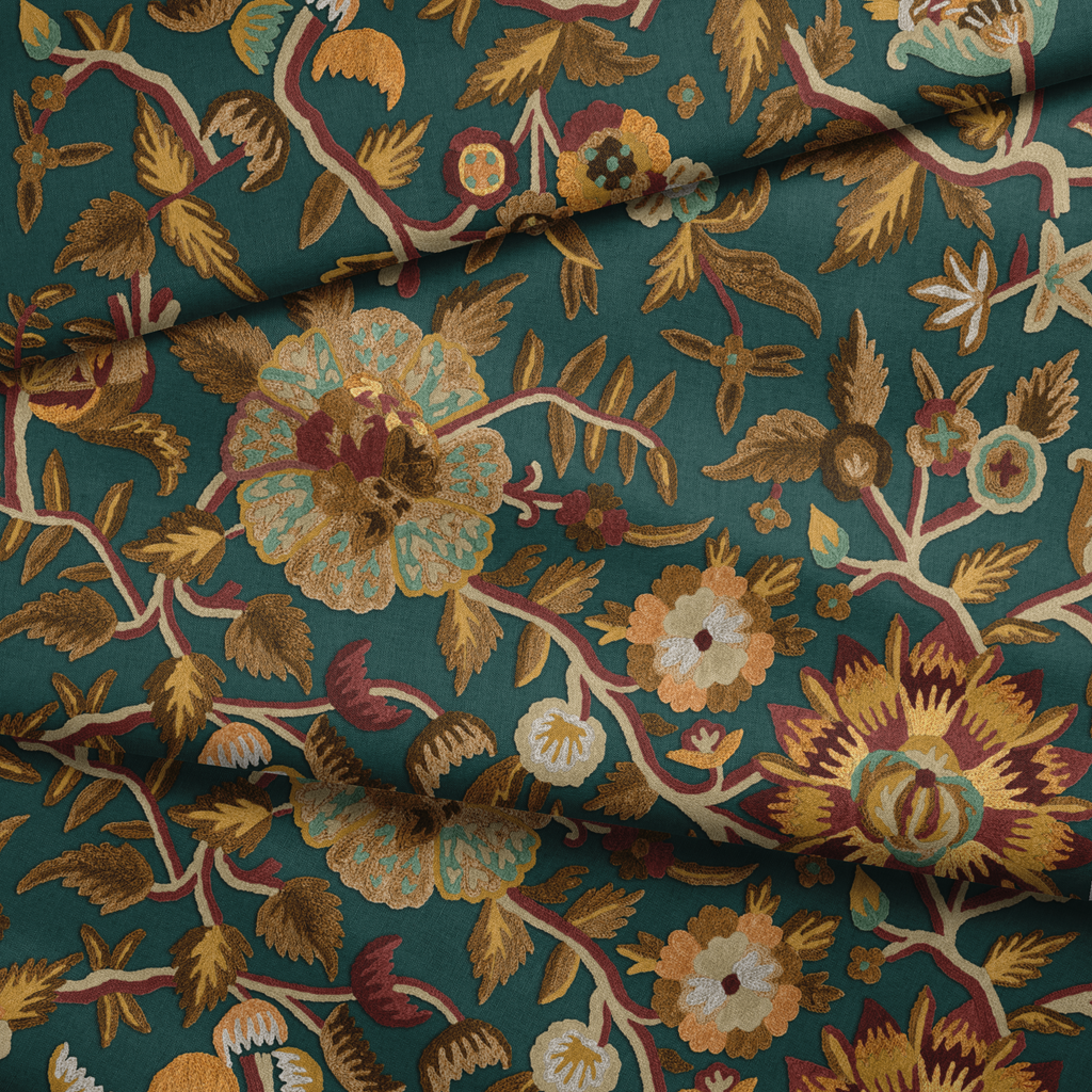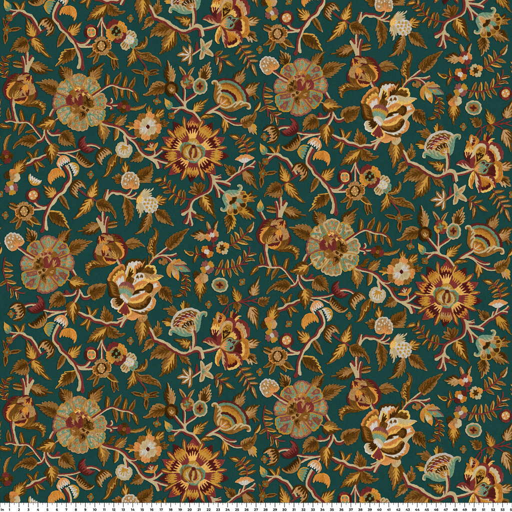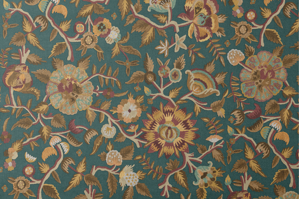 Luxurious traditional floral design with rich teal backdrop, featuring intricate vine motifs and ornate heritage blooms in muted earth tones of gold, rust, and sage. Perfect for adding an elegant touch to any space.