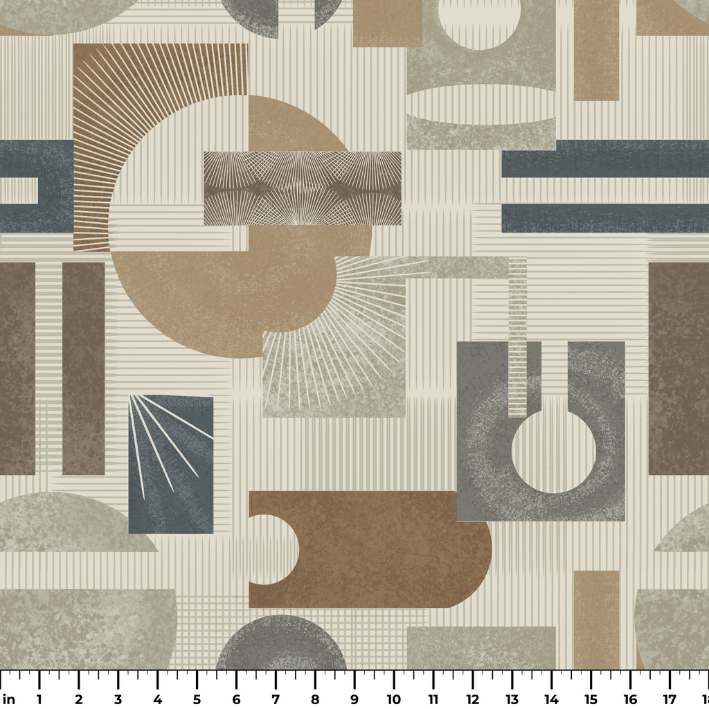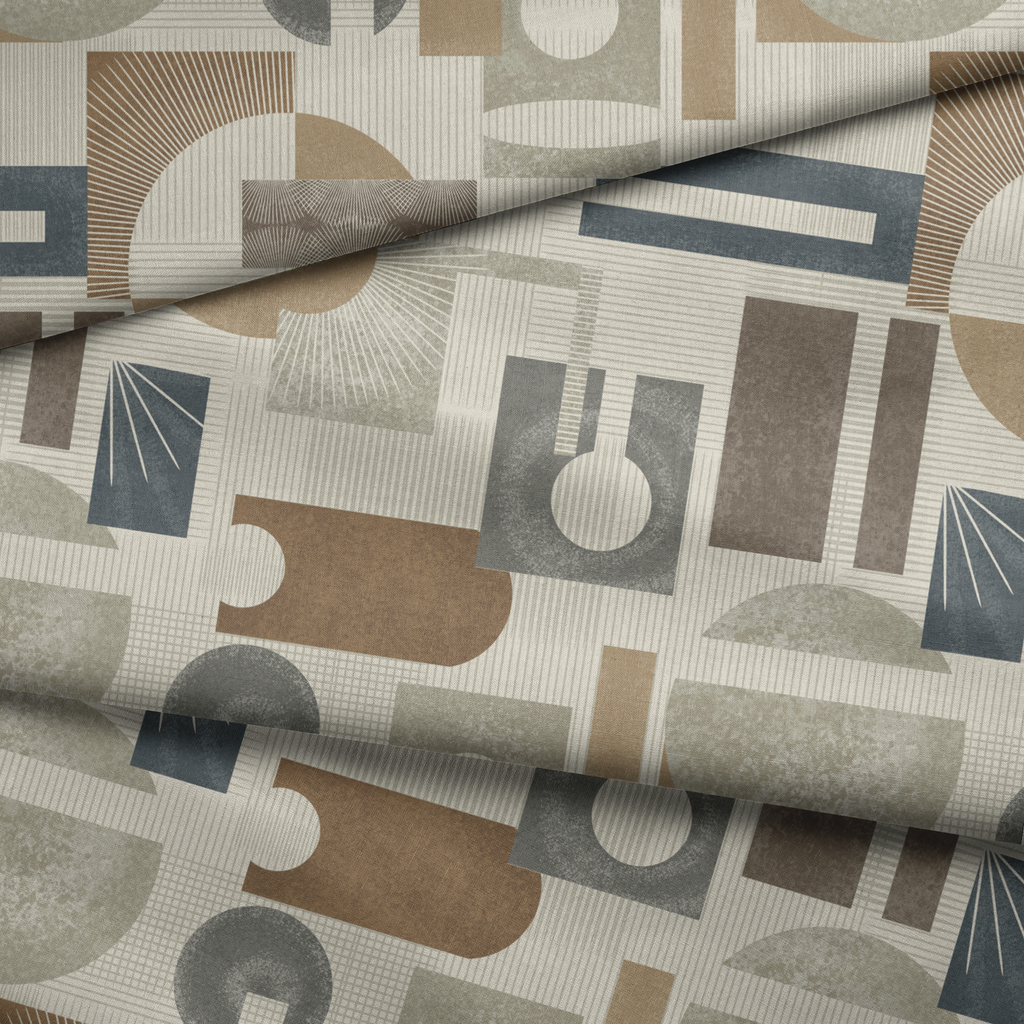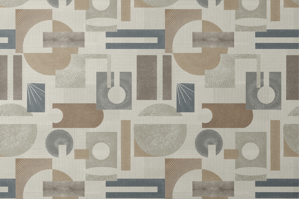 Modern geometric pattern in earthy tones with circular and rectangular shapes creates a sophisticated mid-century inspired design perfect for contemporary rooms.