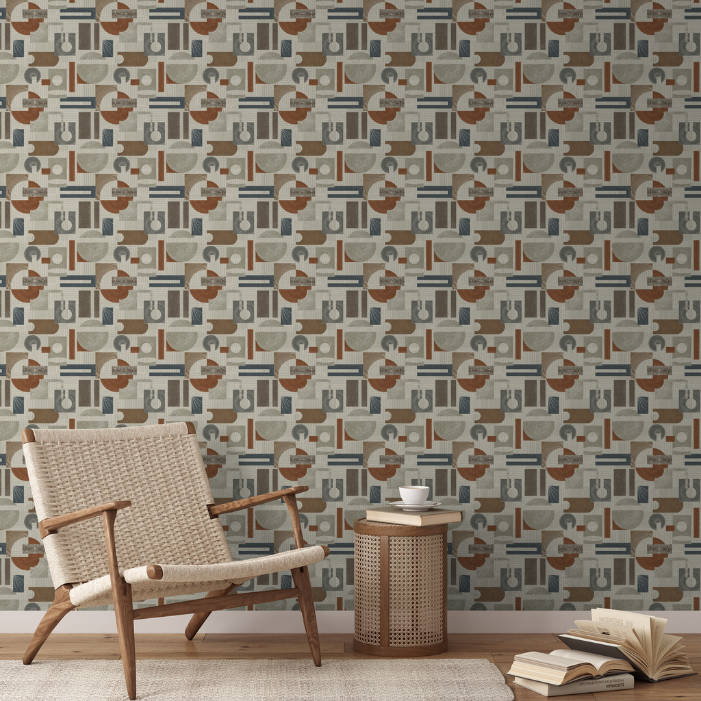 Modern geometric pattern in muted brown and blue tones with circular and rectangular shapes creates a sophisticated mid-century inspired design perfect for contemporary rooms.