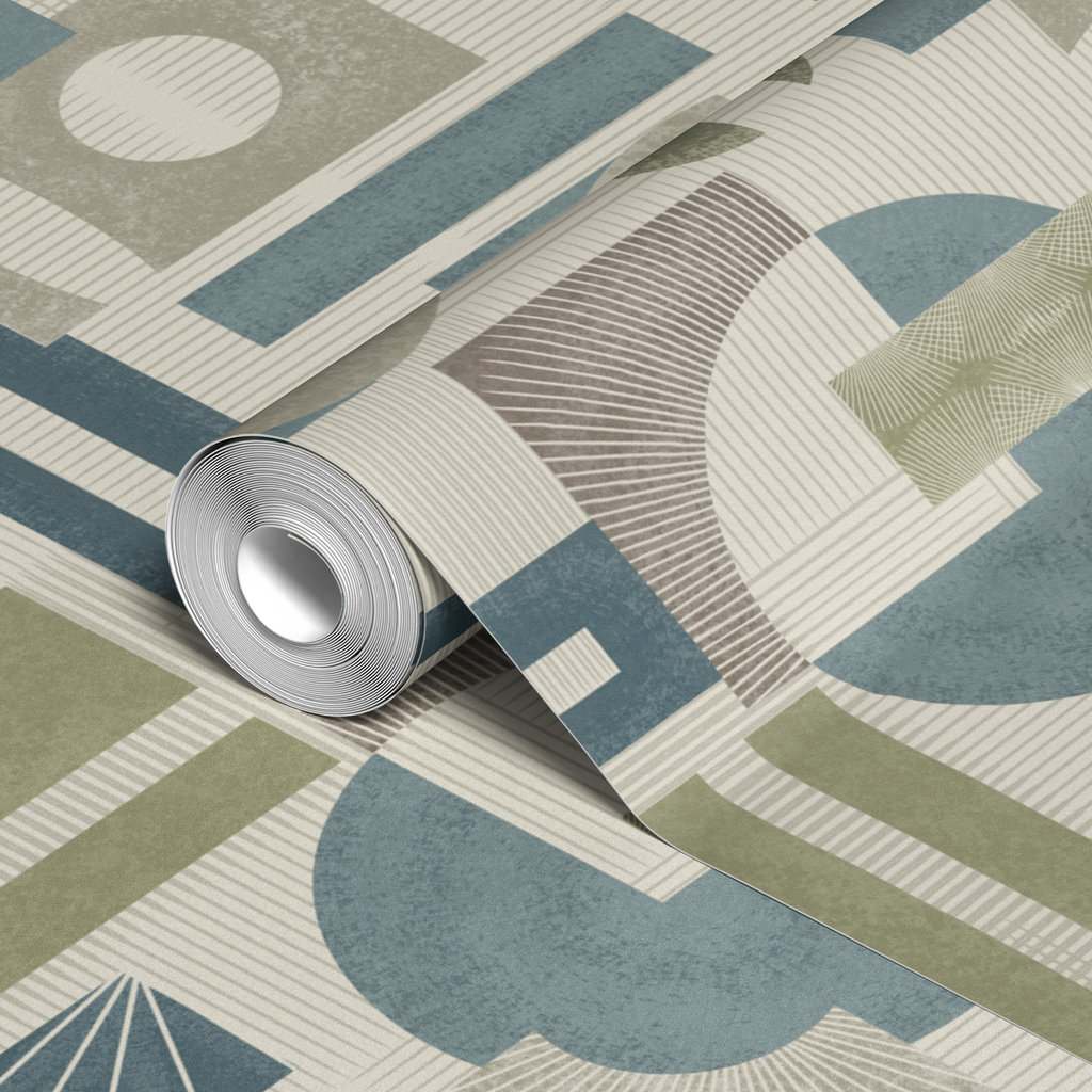 Modern geometric pattern in muted green and blue tones with circular and rectangular shapes creates a sophisticated mid-century inspired design perfect for contemporary rooms.