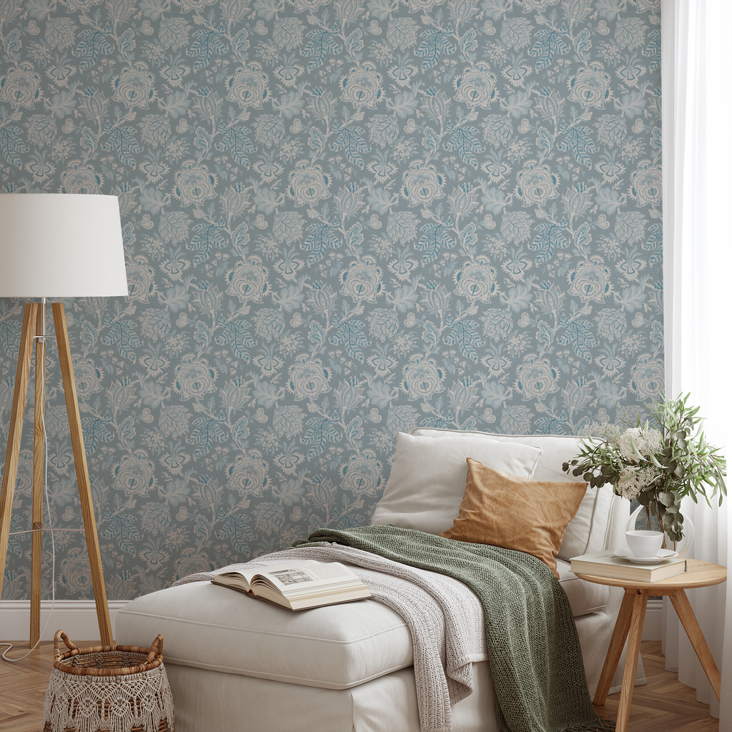 Elegant floral pattern in soft blue and white featuring delicate botanical illustrations with whimsical paisley motifs and flowing curves, perfect for sophisticated home decor.