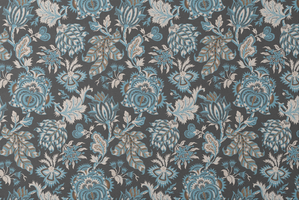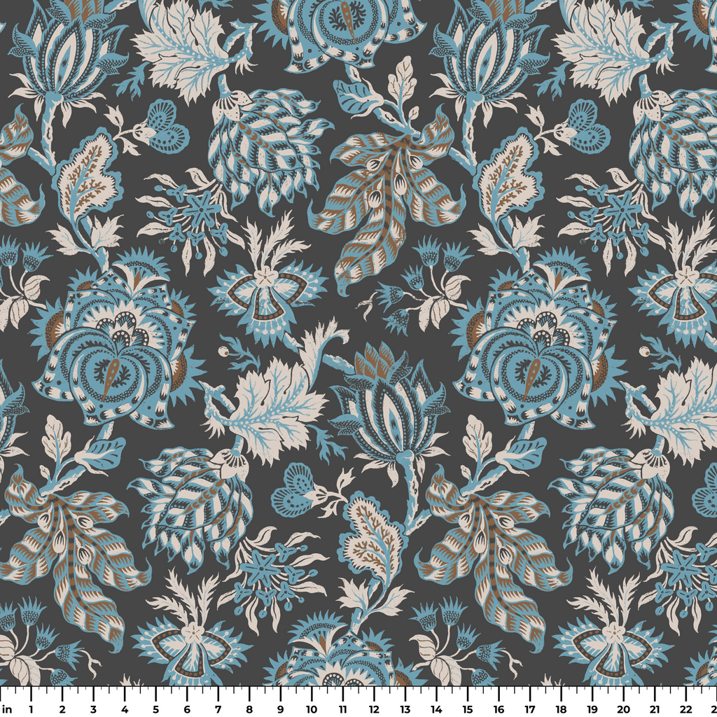 This elegant floral pattern features intricate botanical designs in soft cream and blue tones against a charcoal background, perfect for vintage-inspired spaces.