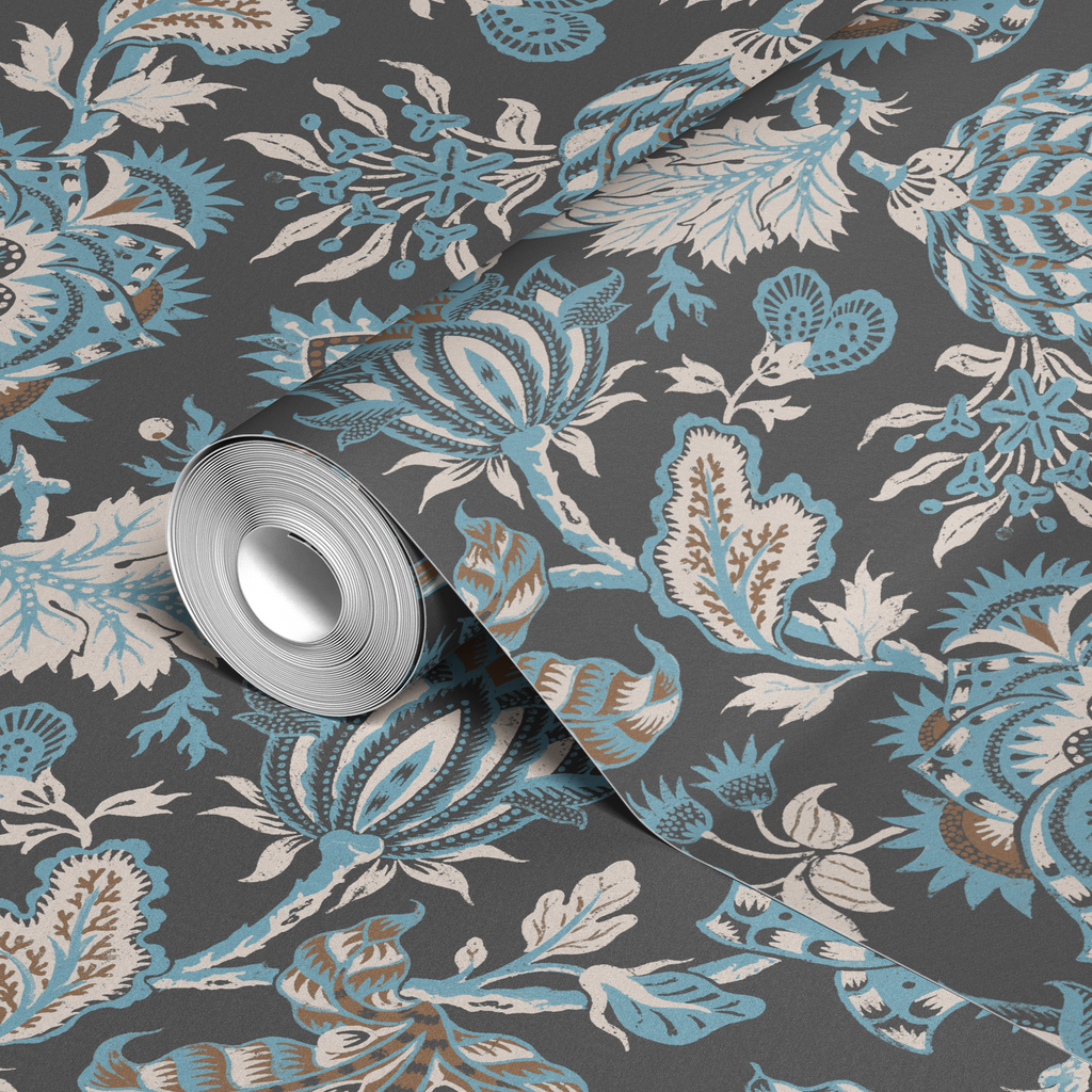 A luxurious floral damask pattern in sophisticated shades of teal, cream, and gray. Traditional botanical motifs create an elegant, timeless design perfect for home decor.