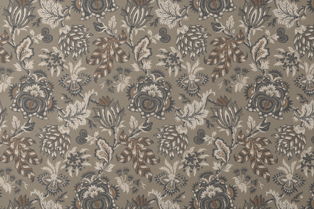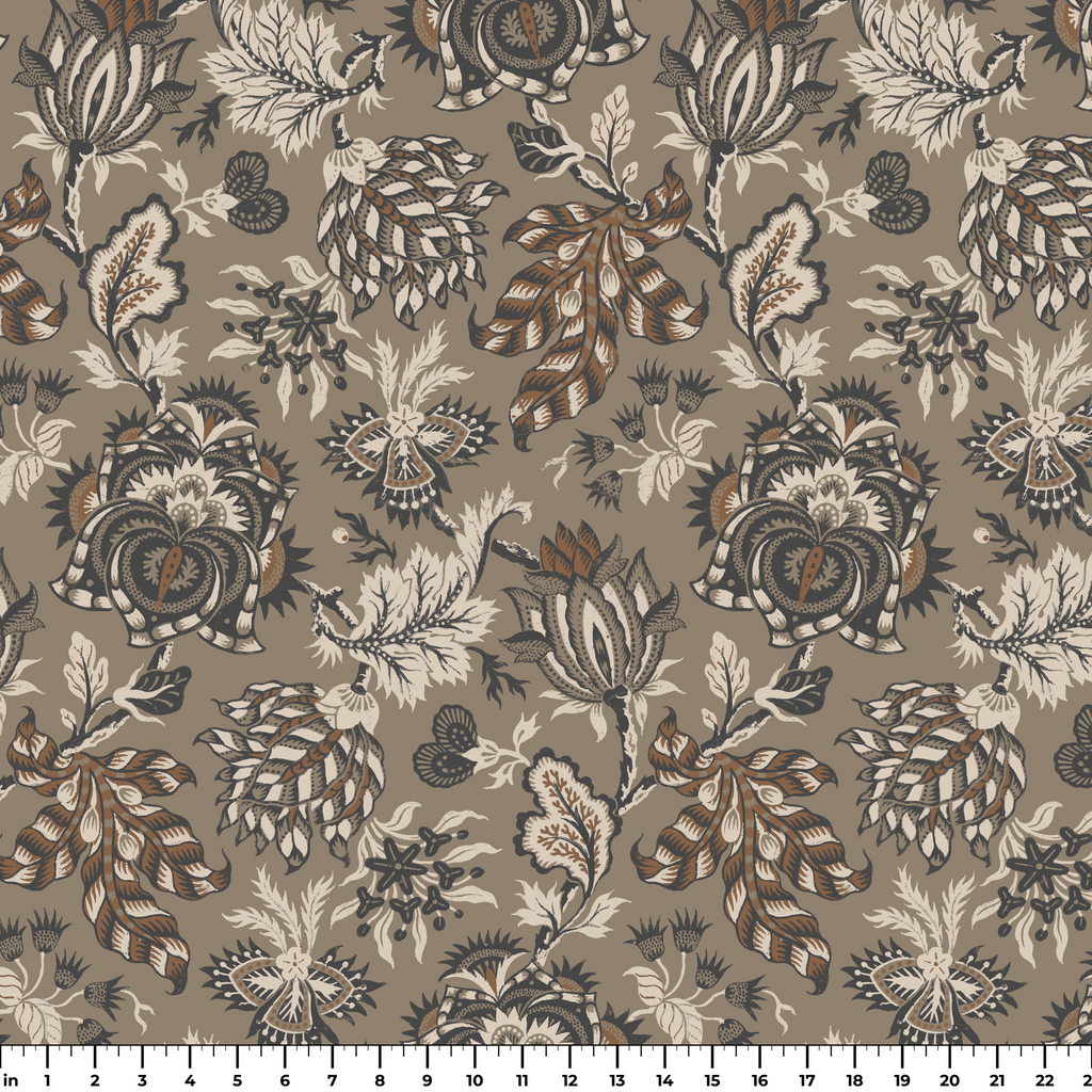 This elegant floral pattern features intricate botanical designs in soft cream and brown tones against a beige background, perfect for vintage-inspired spaces.