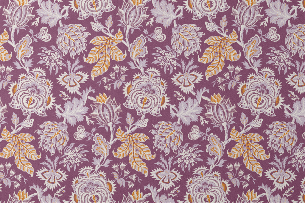 This elegant floral pattern features intricate botanical designs in soft cream and golden yellow tones against a rich purple background, perfect for vintage-inspired spaces.