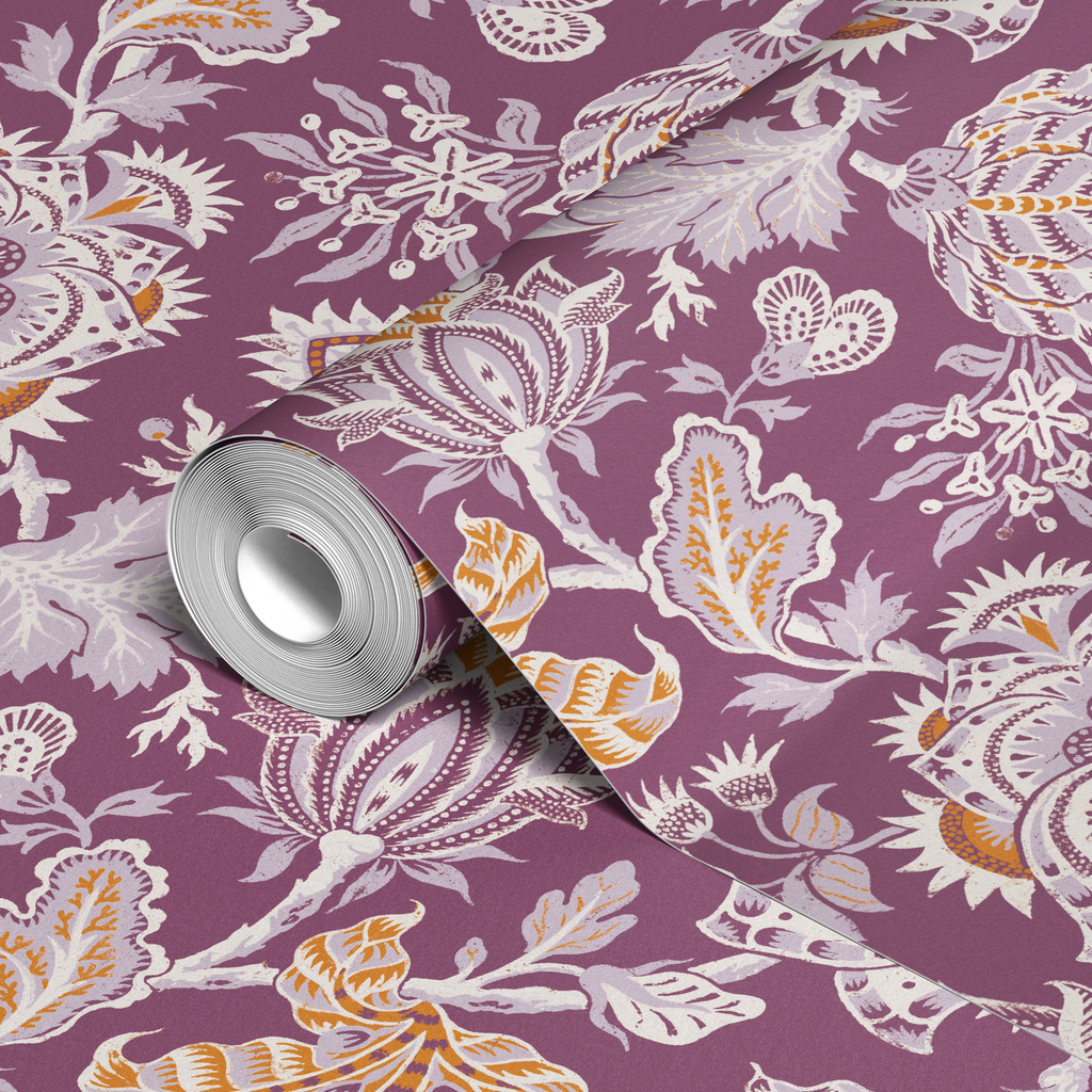 Rich floral pattern featuring intricate botanical illustrations on a deep burgundy background with white, yellow, and orange blossoms creating an elegant, vintage-inspired aesthetic.