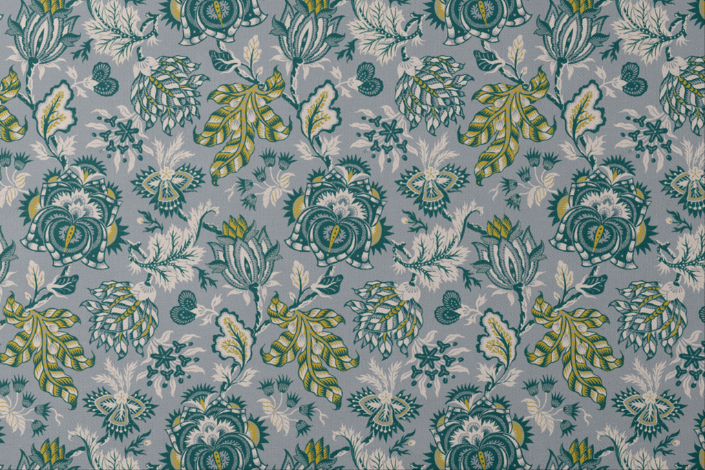This elegant floral pattern features intricate botanical designs in teal and green tones against a gray background, perfect for vintage-inspired spaces.