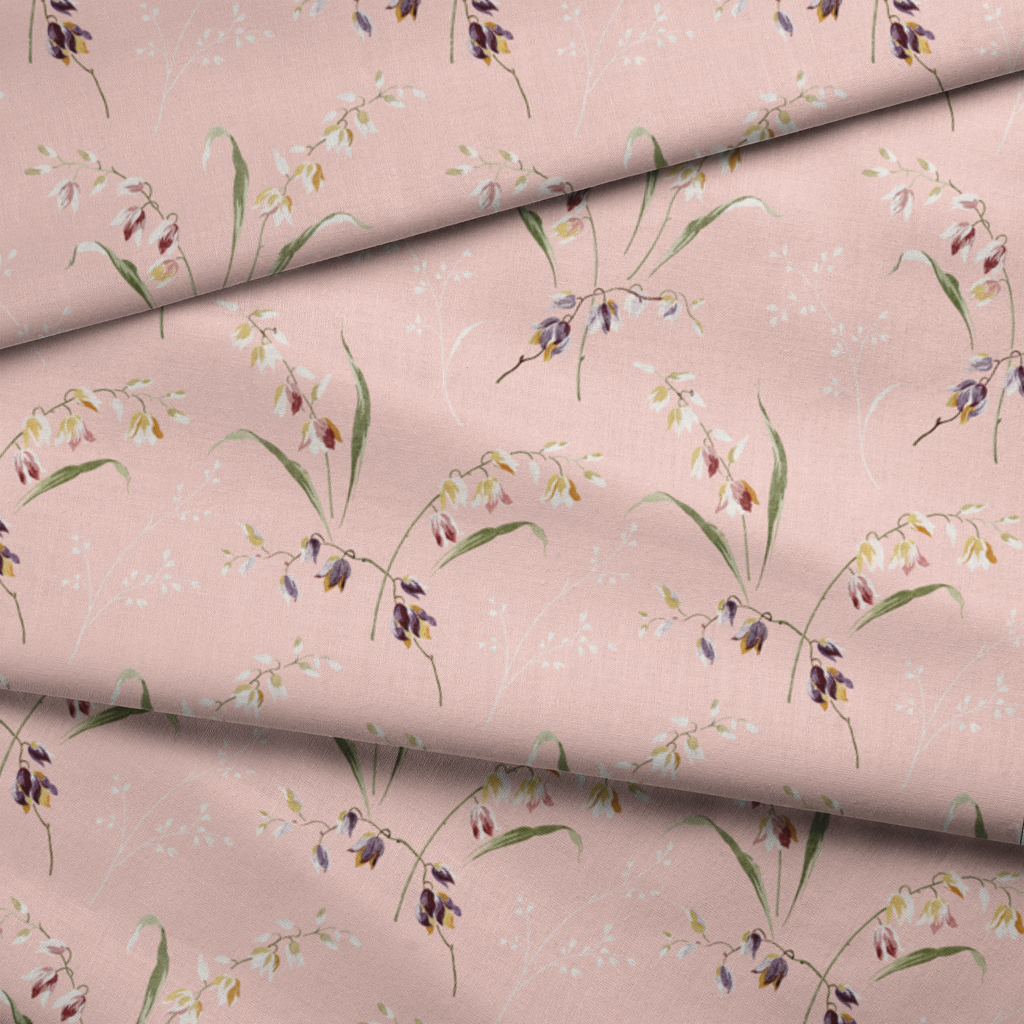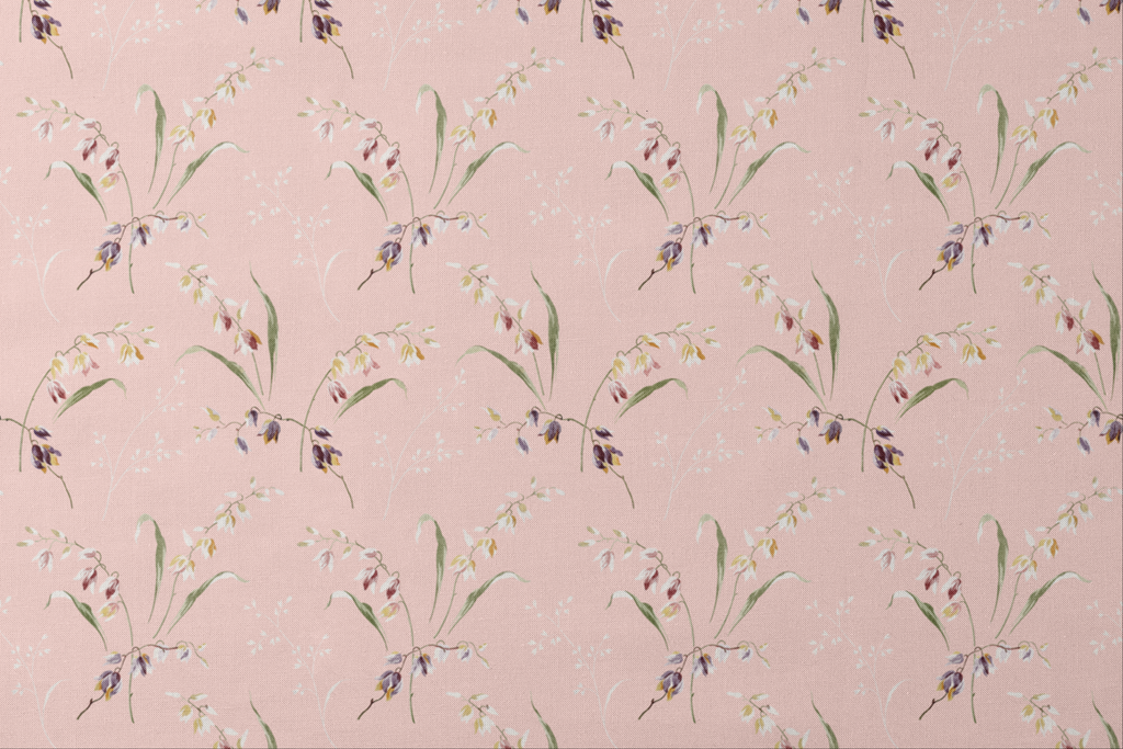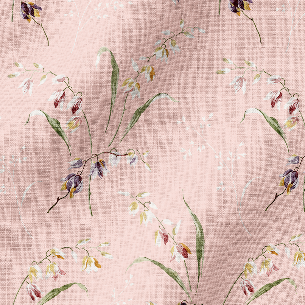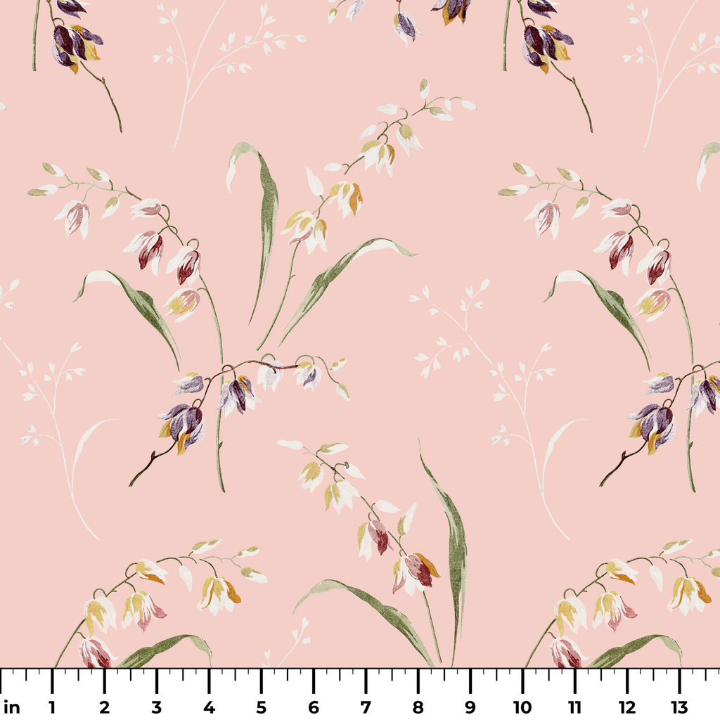 An elegant botanical design featuring delicate white flowers and refined green foliage, arranged across a soft pink backdrop. This composition evokes a sense of quiet beauty and enduring natural grace, steeped in vintage charm.