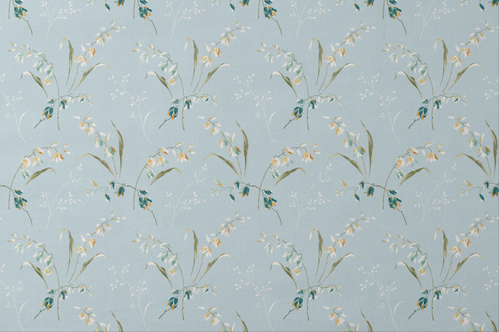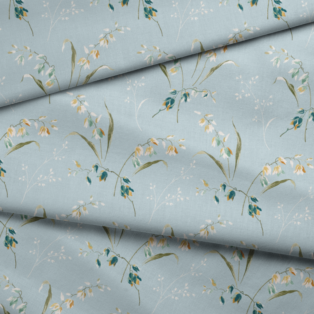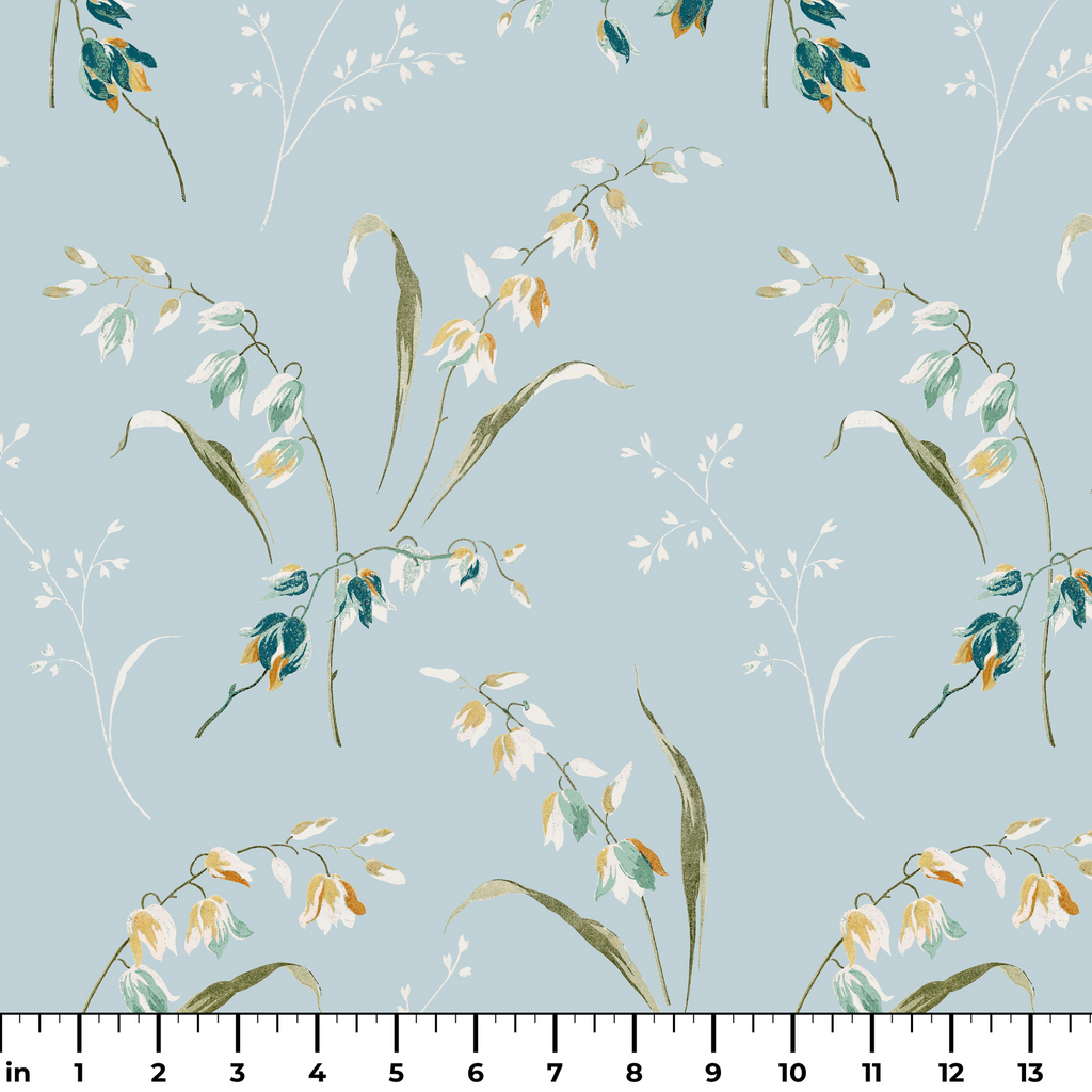 An elegant botanical design featuring delicate white flowers and refined green foliage, arranged across a soft blue backdrop. This composition evokes a sense of quiet beauty and enduring natural grace, steeped in vintage charm.