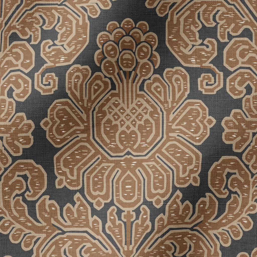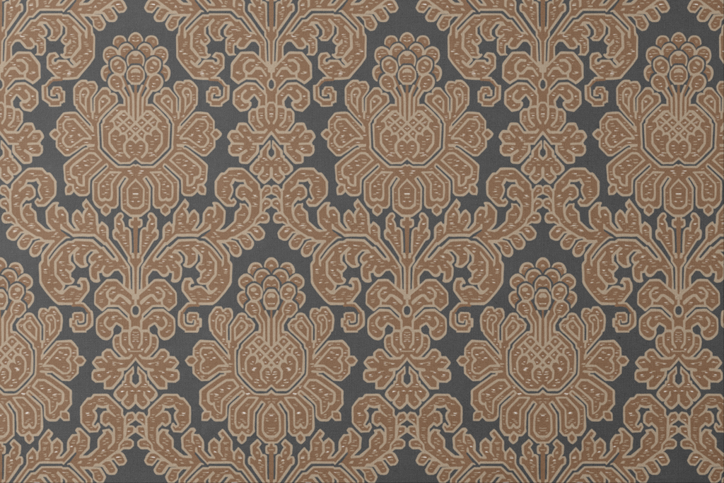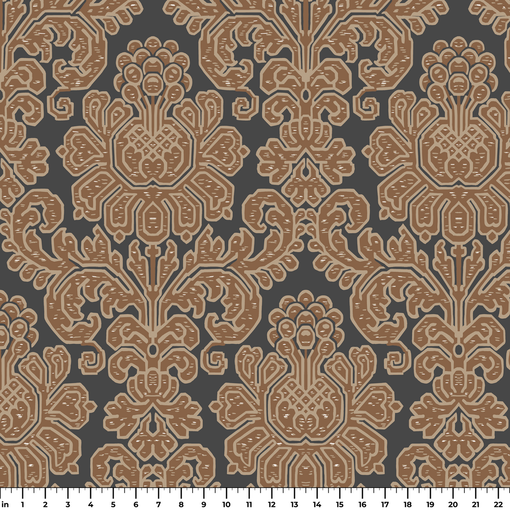 This elegant damask design in bronze shades features traditional heritage-inspired motifs with ornate scrolling florals and intricate medallion designs.