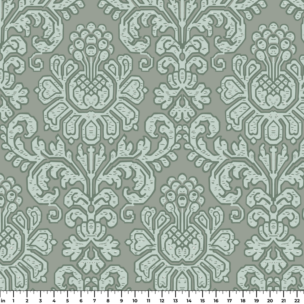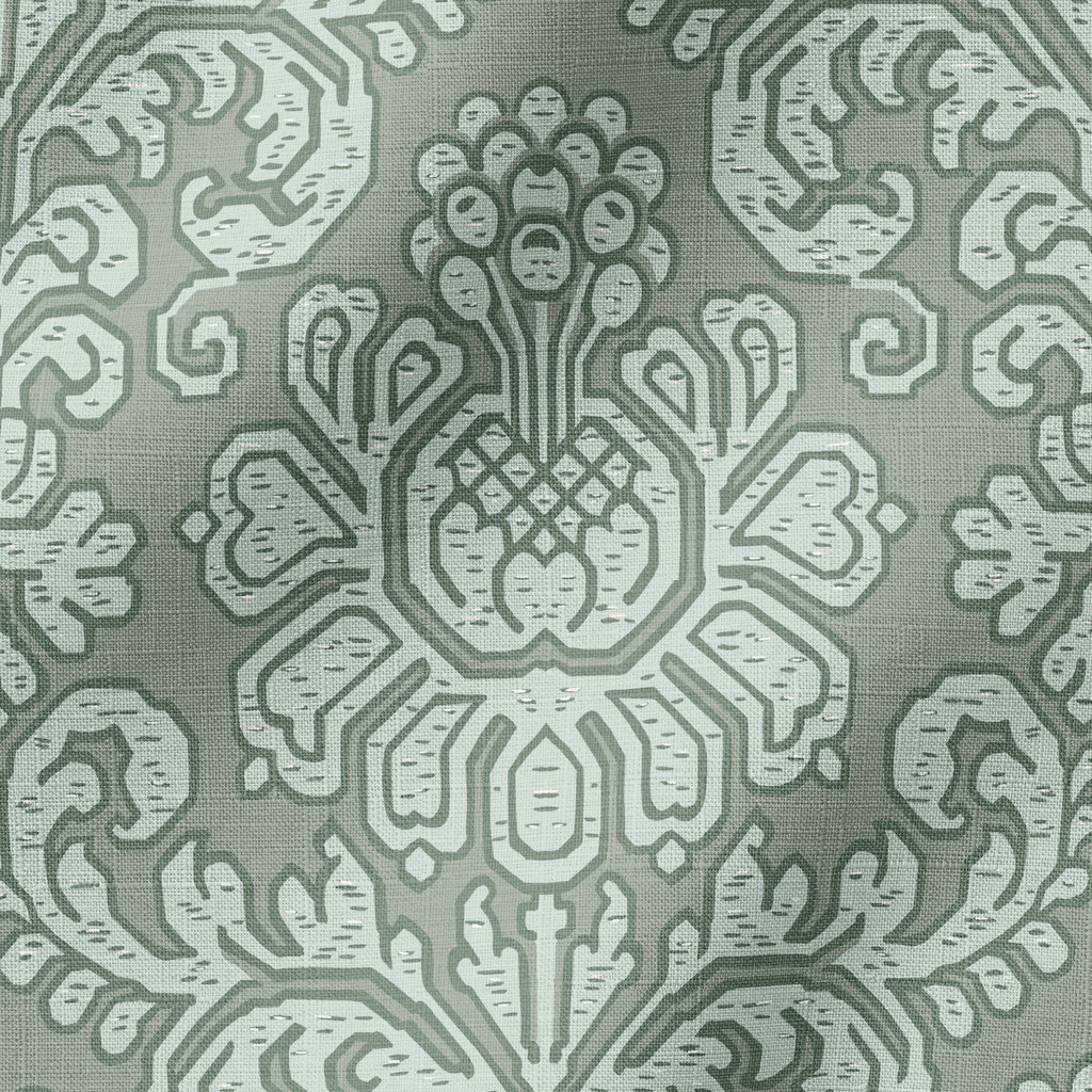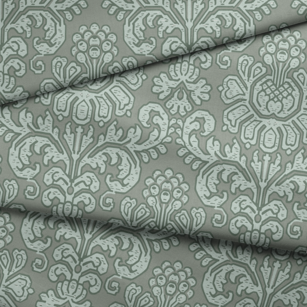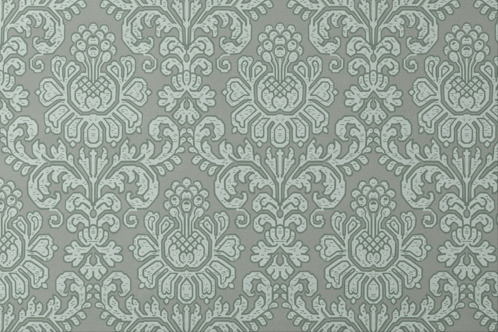 This elegant damask design in mint green and light gray features traditional heritage-inspired motifs with ornate scrolling florals and intricate medallion designs.