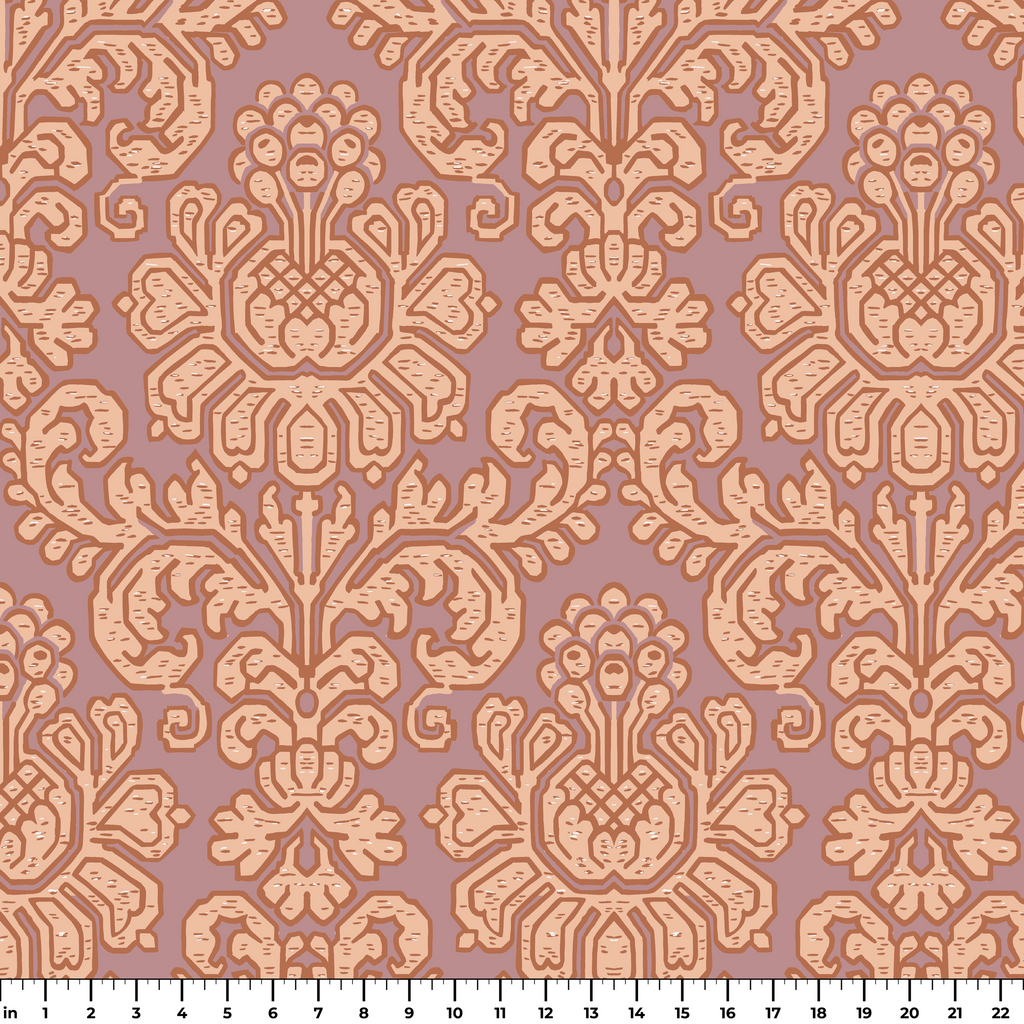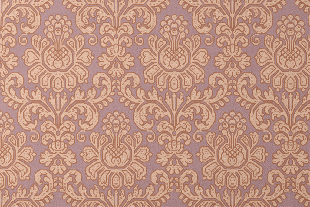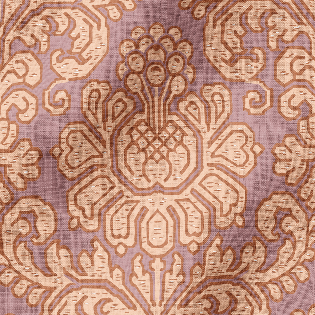 This elegant damask design in soft coral and light purple features traditional heritage-inspired motifs with ornate scrolling florals and intricate medallion designs.