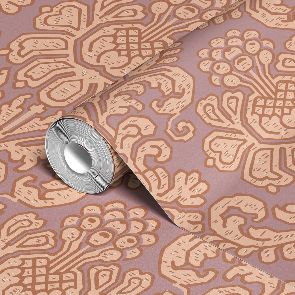 This elegant damask wallpaper features a traditional Victorian-inspired pattern in soft peach and mauve tones, perfect for adding heritage charm to home decor projects.