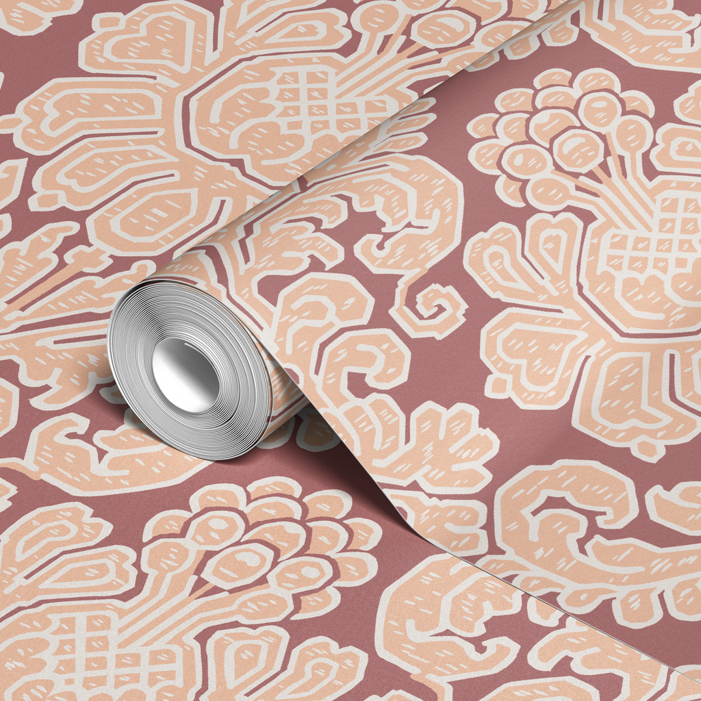 Elegant vintage damask wallpaper in soft peach and burgundy tones, featuring ornate floral medallion patterns with swirling scrollwork for a traditional heritage aesthetic.