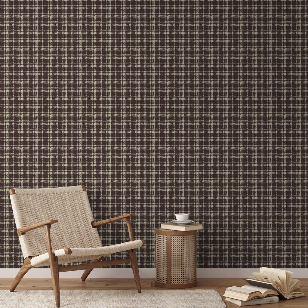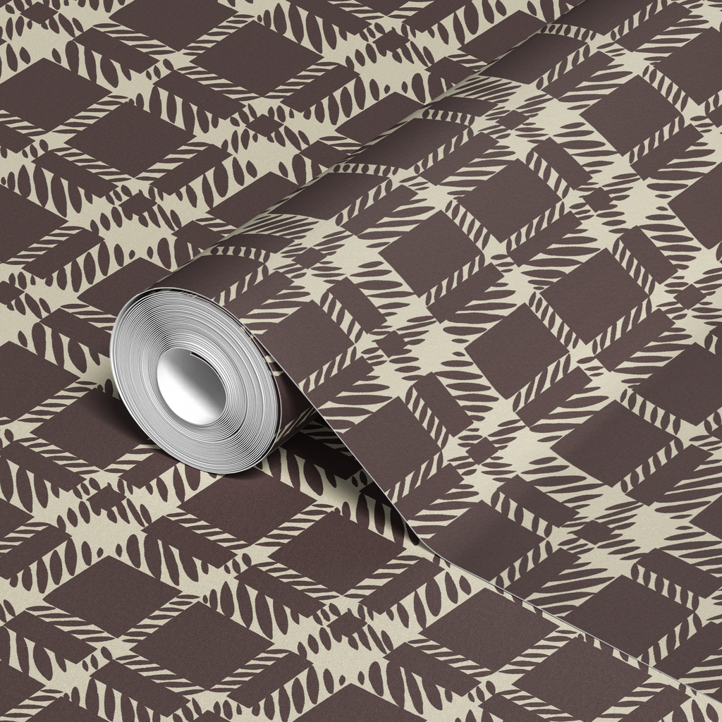 Bold geometric pattern featuring rich brown squares with diagonal striped accents in a classic checkerboard layout on a cream background. Ideal for sophisticated home decor with a contemporary heritage feel.