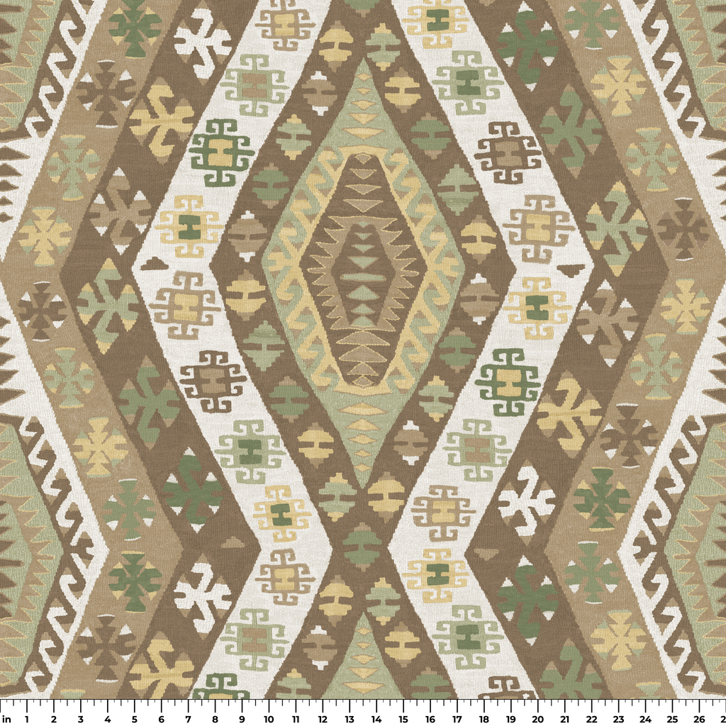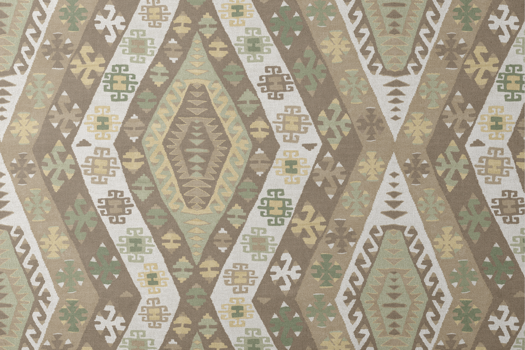 Rich traditional kilim pattern featuring geometric medallions in muted sage, brown, and beige tones, showcasing authentic tribal motifs with a vintage Southwestern heritage design.