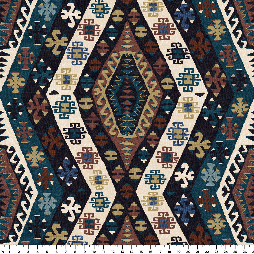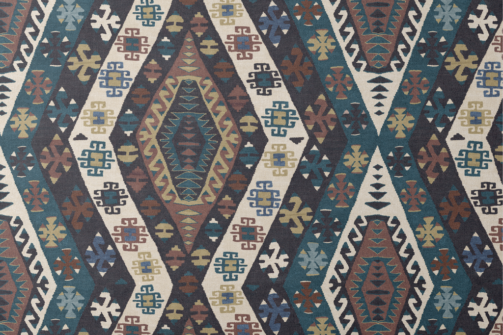 Rich traditional kilim pattern featuring geometric medallions in navy, rust, and cream tones, showcasing authentic tribal motifs with a vintage Southwestern heritage design.