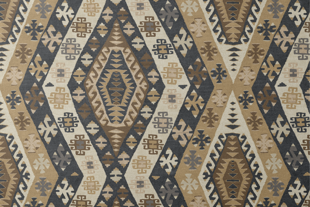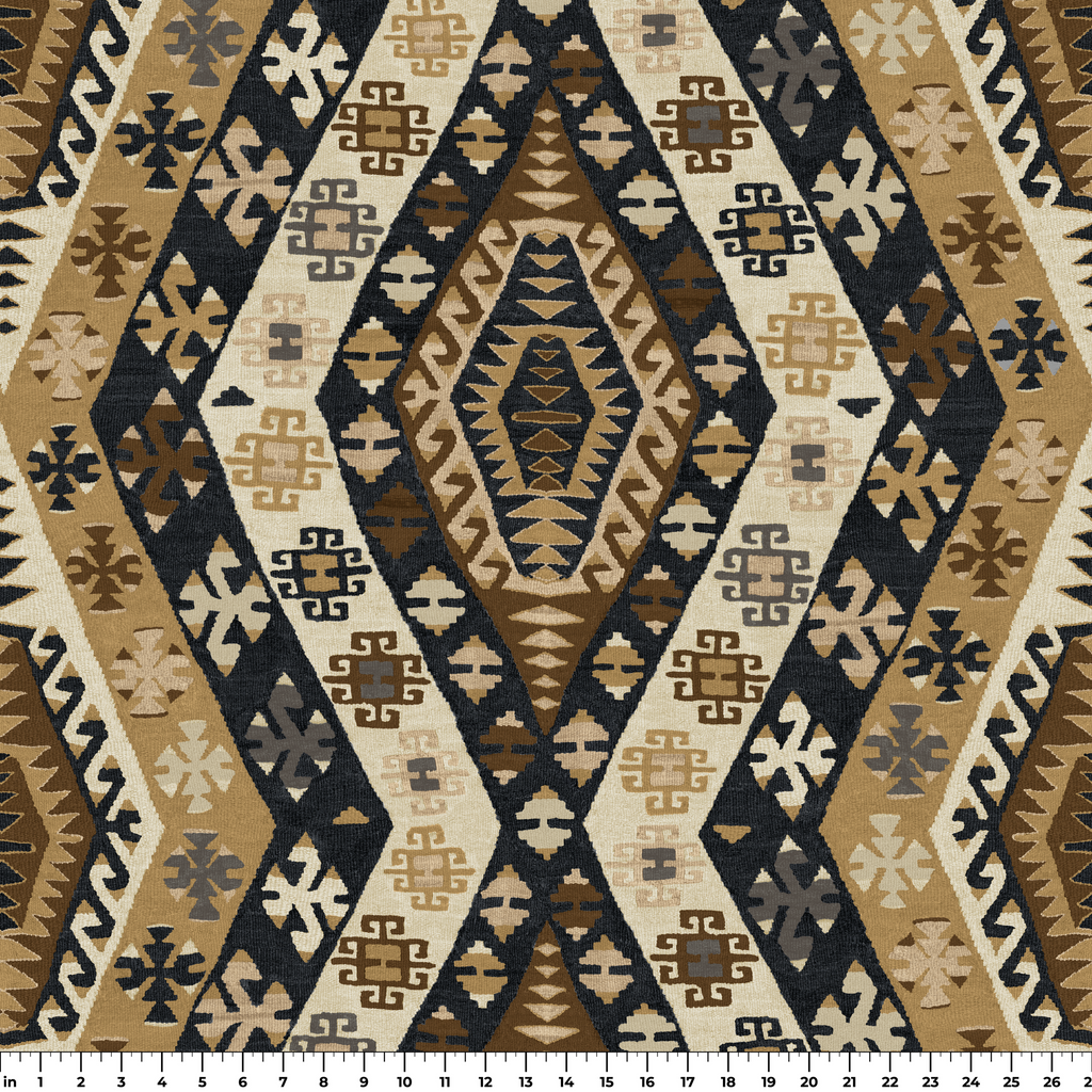 Rich traditional kilim pattern featuring geometric medallions in brown, black, and beige tones, showcasing authentic tribal motifs with a vintage Southwestern heritage design.