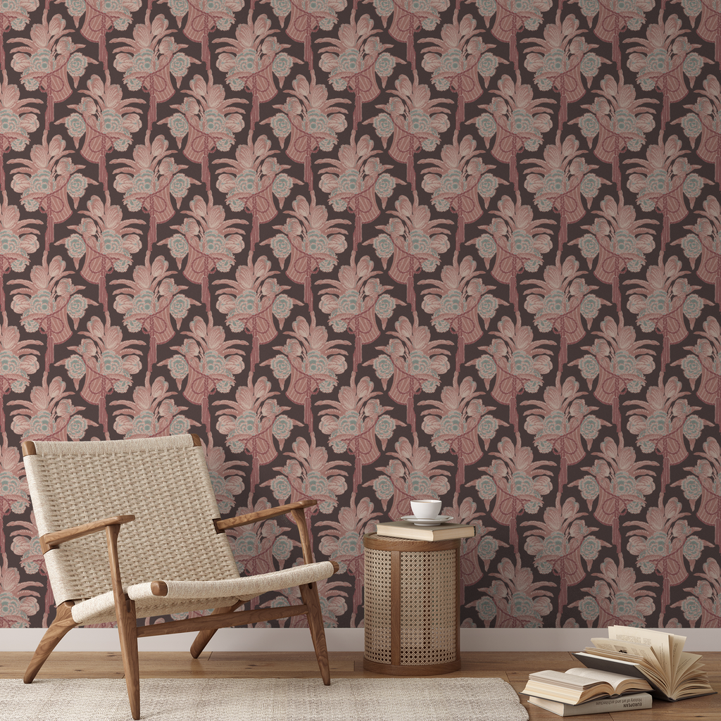 Elegant vintage floral pattern with dusty pink blooms and delicate botanical illustrations on a rich brown background. Perfect for heritage-inspired home decor projects.