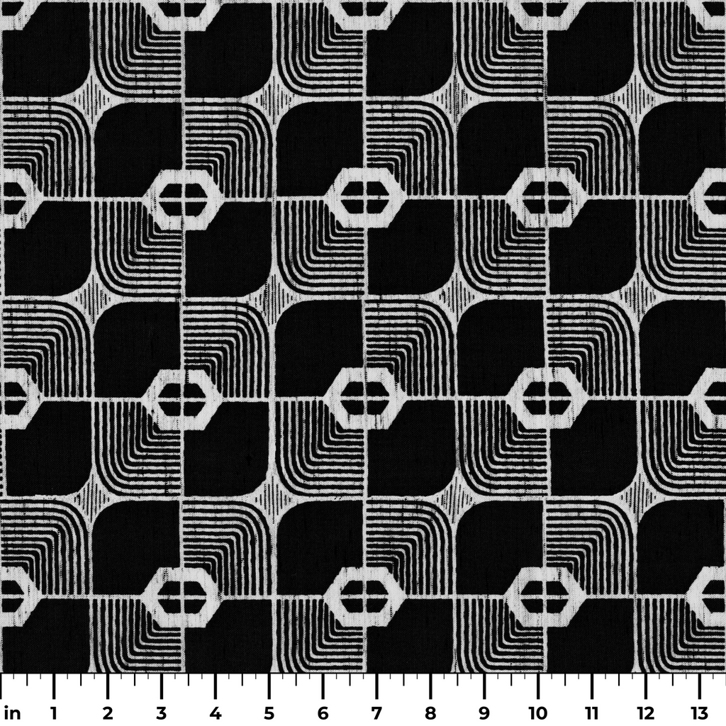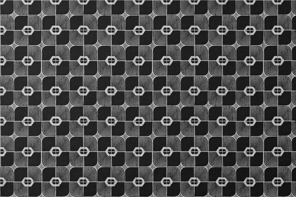 Sleek geometric pattern featuring black squares with white circular circuit-like designs. This retro tech-inspired motif creates a modern, minimalist look with a striking monochromatic aesthetic.
