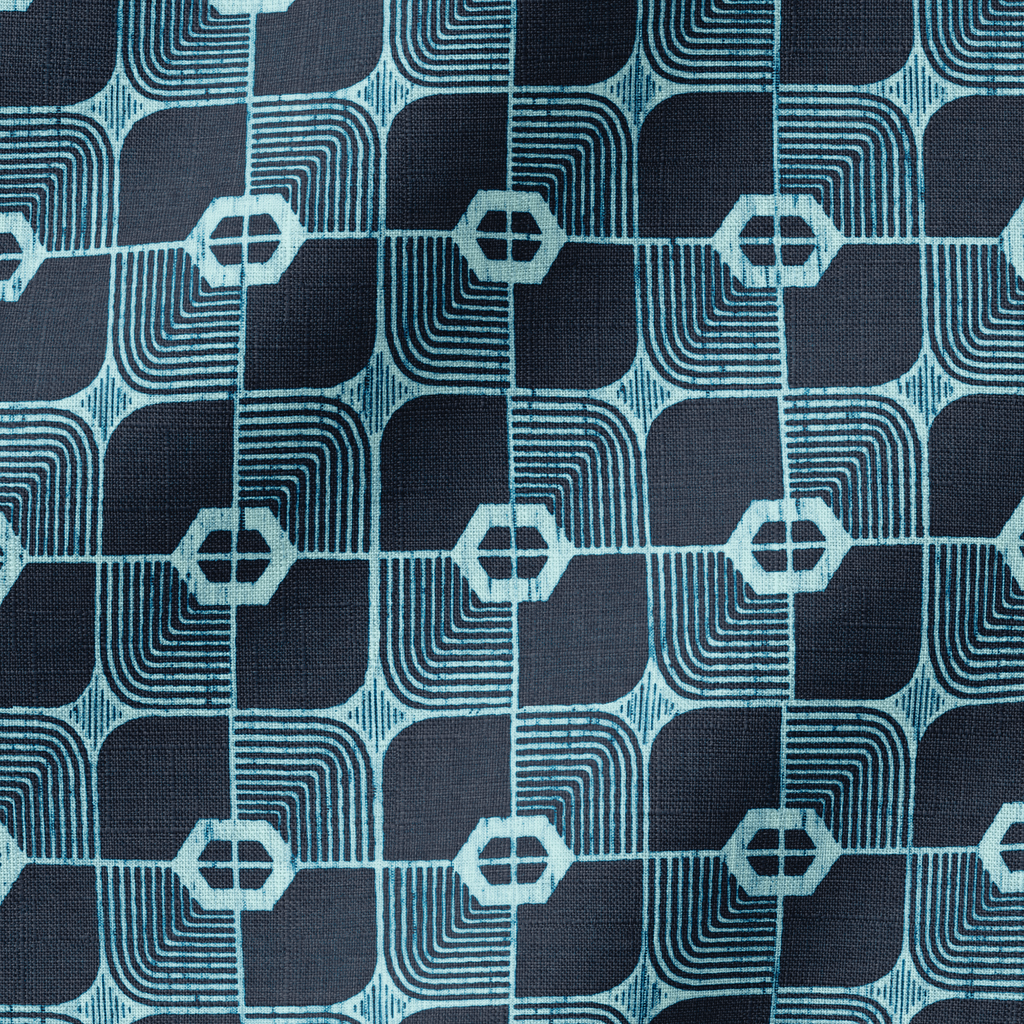 Elegant geometric pattern featuring turquoise designs on a dark navy background. Modern tech-inspired motif creates a seamless repeating layout with sleek retro appeal.
