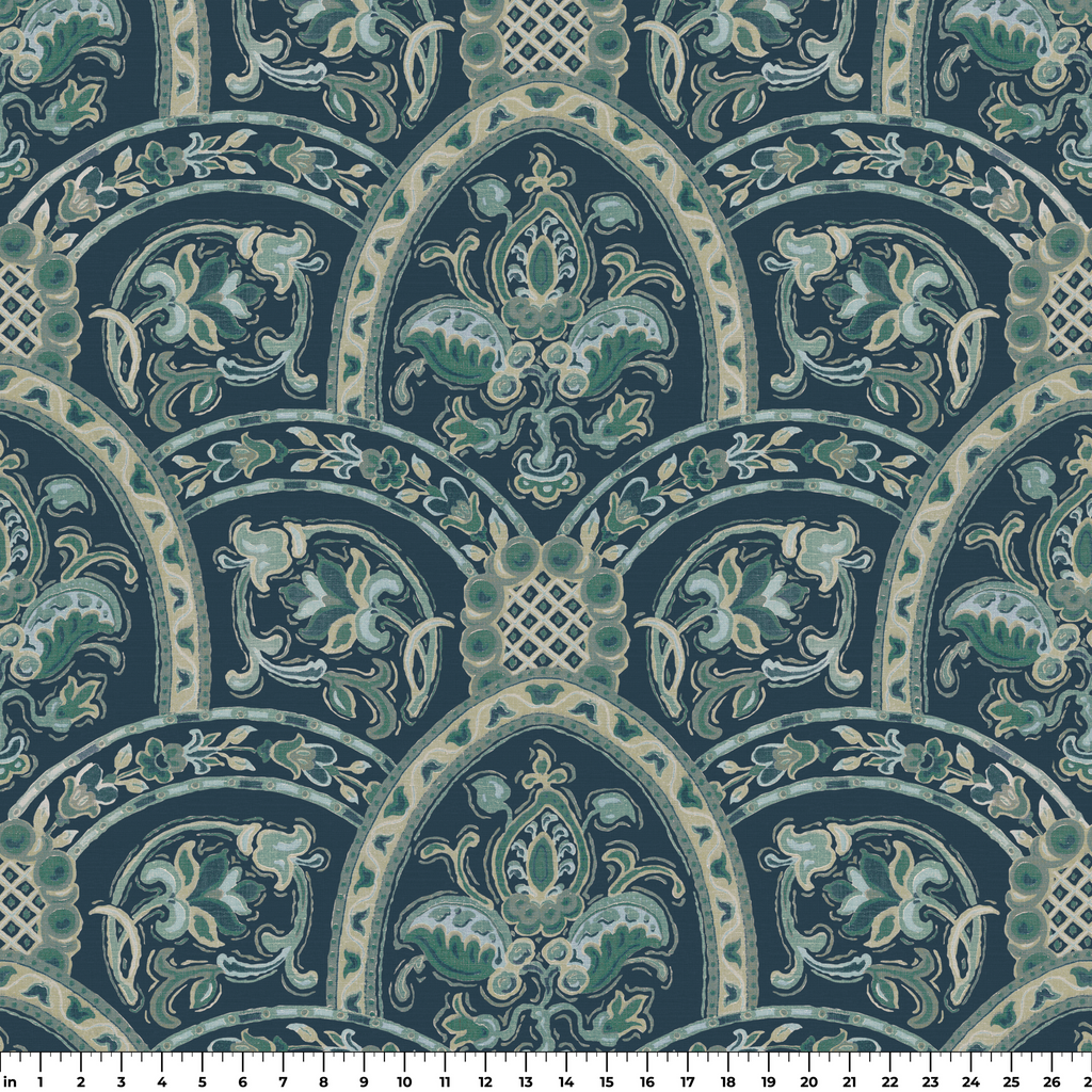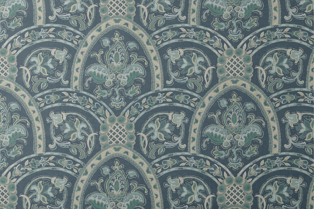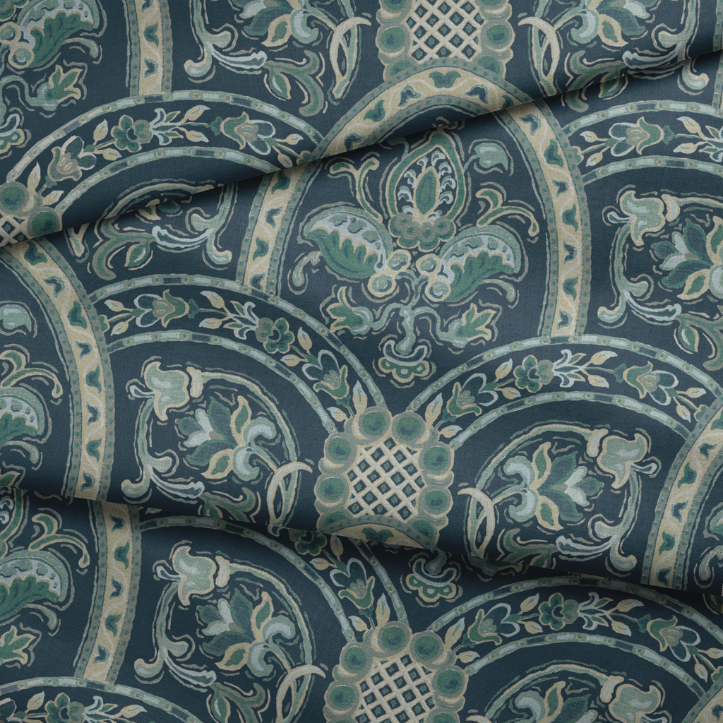 Elegant traditional damask in rich navy and sage tones creates a luxurious heritage pattern with intricate floral medallions and ornate scrollwork, perfect for a sophisticated look.