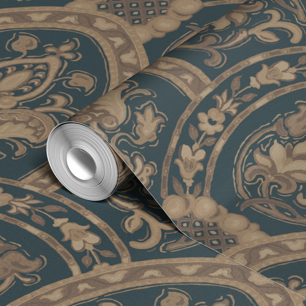 Elegant traditional damask in black and brown tones creates a luxurious heritage pattern with intricate floral medallions and ornate scrollwork, perfect for a sophisticated look.