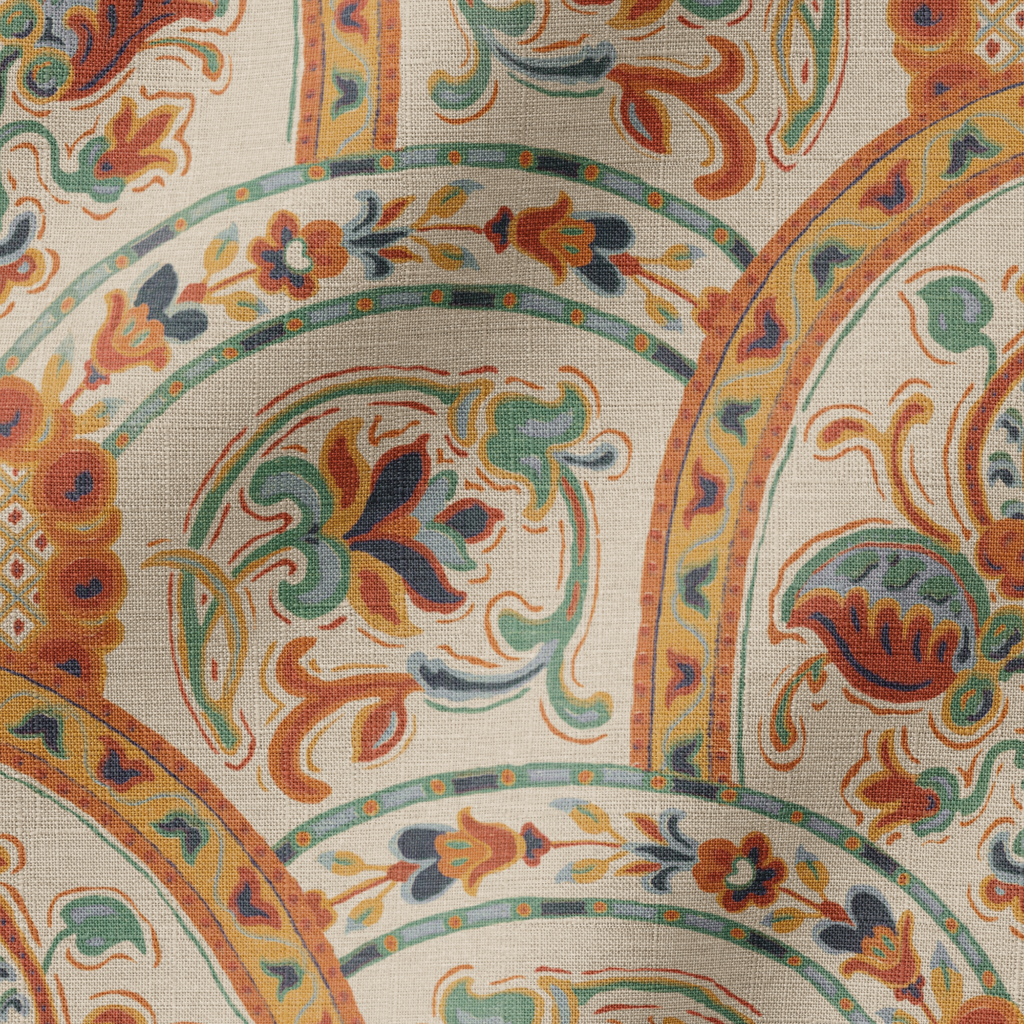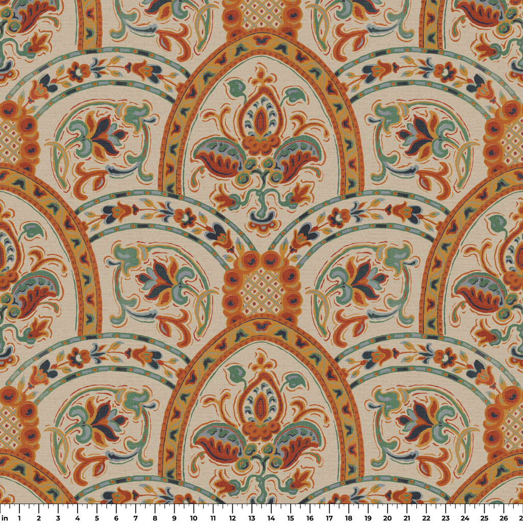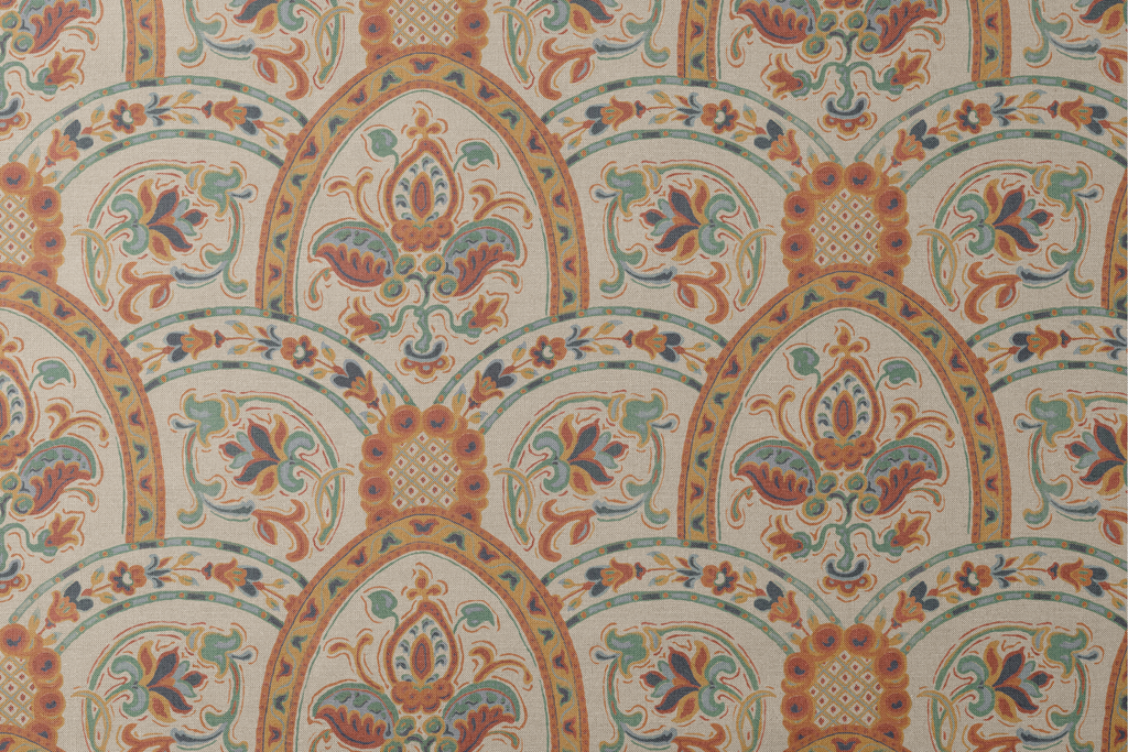Elegant traditional damask in orange, cream and green tones creates a luxurious heritage pattern with intricate floral medallions and ornate scrollwork, perfect for a sophisticated look.