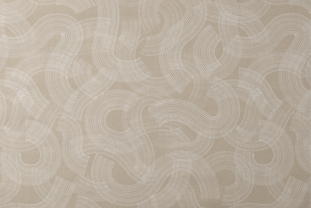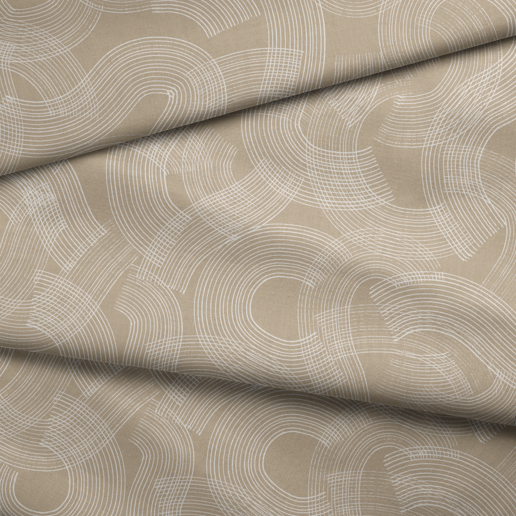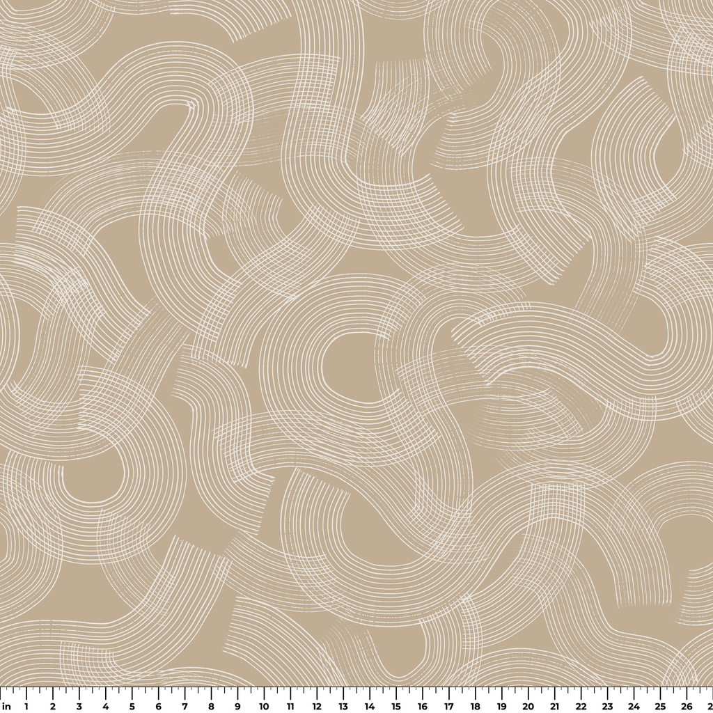 Elegant beige and cream abstract swirls create a sophisticated pattern of flowing curves and concentric circles, offering a contemporary organic design with a calming, textured appearance.